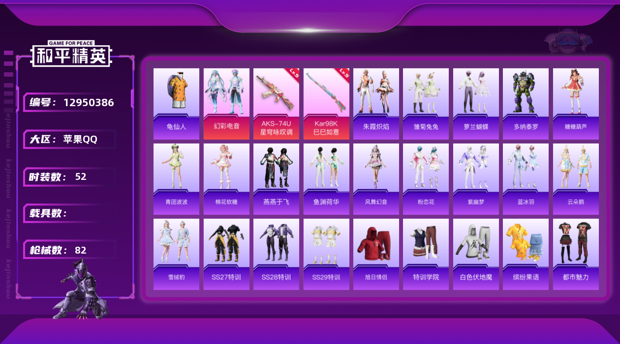 [12950386]【特价急出/详情看图】:苹果 手Q-1粉装-2特效枪-2.3w热力值-6王牌印记-52套装-82枪皮【热门品类】:套装-派对舞王,套装-龟仙人【粉色套装】:粉装-幻彩电音【粉色枪皮等级】:AKS-74U-星穹咏叹调(五级),Kar98K-巳巳如意(五级)