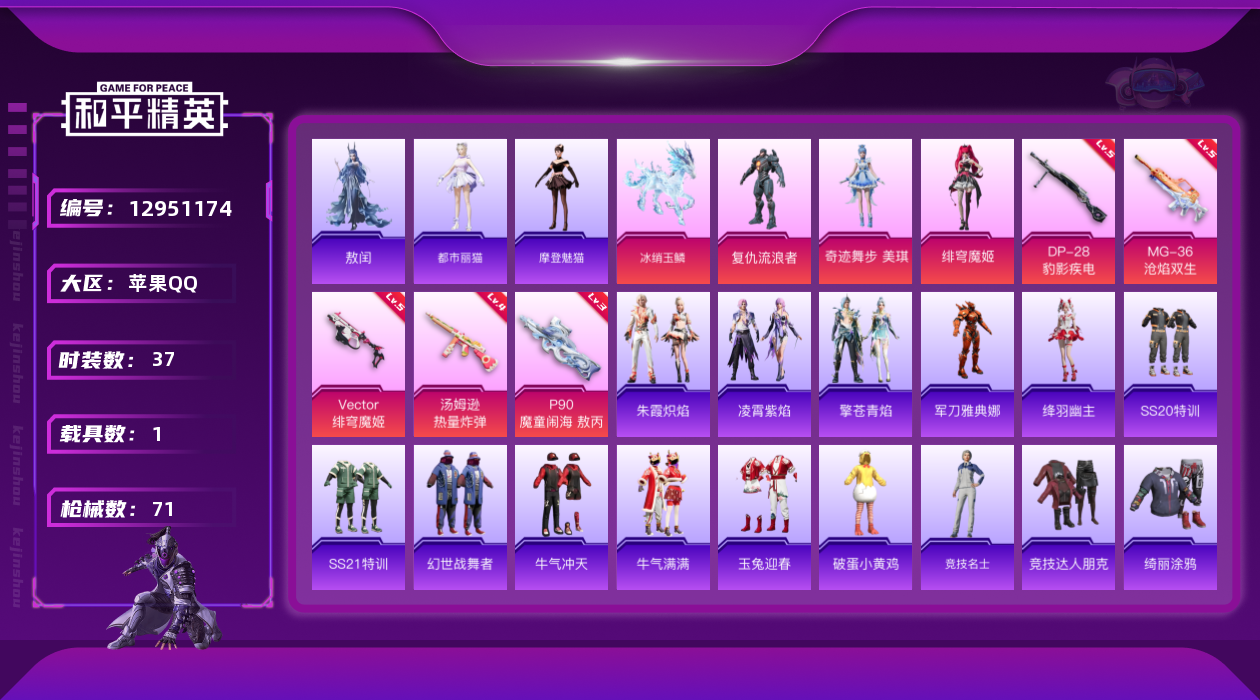 [12951174]【特价急出/详情看图】:苹果 手Q-3粉装-5特效枪-1载具-3粉色飞行器-2.2w热力值-3王牌印记-37套装-71枪皮【热门品类】:角色-军刀雅典娜【粉色载具】:冰绡玉鳞【粉色套装】:角色-复仇流浪者,角色-绯穹魔姬,角色-奇迹舞步 美琪【粉色枪皮等级】:Vector-绯穹魔姬(五级),汤姆逊-热量炸弹(四级),P90-魔童闹海 敖丙(三级),DP-28-豹影疾电(五级),MG-36-沧焰双生(五级)【粉色飞行器】:飞天猪飞行器,灵珠游龙飞行器