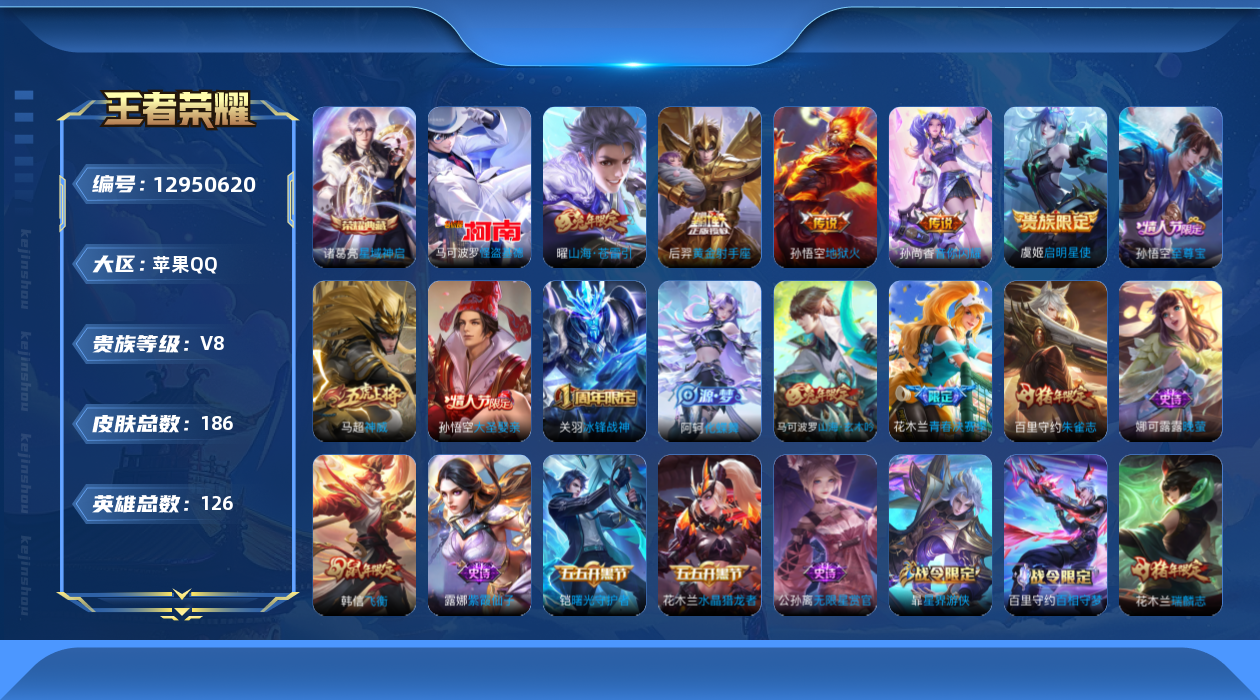[12950620]苹果Q-V8-尊贵铂金I段位-124英雄-186皮肤-1典藏-1珍品传说-5传说-51史诗 【荣耀典藏】:诸葛亮星域神启 【珍品传说】:马可波罗怪盗基德 【传说皮肤】:曜山海苍雷引,孙尚香音你闪耀,虞姬启明星使,后羿黄金射手座,孙悟空地狱火 【限定皮肤】:蒙犽顽岩魄,杨戬破阵退雄兵,狄仁杰阴阳师,赵云皇家上将,嬴政白昼王子,芈月重明,吕布猎兽之王,夏侯惇朔风刀,甄姬游园惊梦,曹操烛龙,典韦穷奇,马可波罗山海玄木吟,狄仁杰魔术师,项羽海滩派对,老夫子醍醐杖,关羽冰锋战神,貂蝉逐梦之音,韩信飞衡,花木兰青春决赛季,花木兰瑞麟志,孙悟空至尊宝,孙悟空大圣娶亲,牛魔御旌,虞姬启明星使,钟馗驱傩正仪,杨玉环遇见飞天,百里守约朱雀志,弈星混沌棋,明世隐疑决卦,裴擒虎擒涛扼浪,狂铁御狮,米莱狄御霄,云中君纤云弄巧,盾山御銮,嫦娥暖冬兔眠,曜山海苍雷引,鲁班大师探海日志,桑启海盐诗旅,暃星界游侠,艾琳女武神,张良古海寻踪,鬼谷子天穹祈灯,刘邦剑破天穹,程咬金群星魔术团,周瑜熔金海岸 【年限皮肤】:百里守约朱雀志,花木兰瑞麟志,韩信飞衡,马超神威,马可波罗山海玄木吟,曜山海苍雷引 【赛季限定】:芈月重明,夏侯惇朔风刀,曹操烛龙,典韦穷奇,老夫子醍醐杖,张良古海寻踪,牛魔御旌,钟馗驱傩正仪,弈星混沌棋,明世隐疑决卦,裴擒虎擒涛扼浪,狂铁御狮,米莱狄御霄,盾山御銮,鲁班大师探海日志,桑启海盐诗旅,鬼谷子天穹祈灯,刘邦剑破天穹 【战令限定】:嬴政白昼王子,吕布猎兽之王,嫦娥暖冬兔眠,暃星界游侠 【史诗皮肤】:露娜紫霞仙子,赵云皇家上将,赵云未来纪元,貂蝉圣诞恋歌,王昭君偶像歌手,狄仁杰魔术师,宫本武藏鬼剑武藏,孙尚香水果甜心,嬴政摇滚巨星,墨子金属风暴,吕布圣诞狂欢,曹操幽灵船长,李白千年之狐,张飞乱世虎臣,韩信白龙吟,关羽冰锋战神,貂蝉逐梦之音,孙悟空至尊宝,花木兰水晶猎龙者,夏侯惇乘风破浪,兰陵王暗隐猎兽者,诸葛亮黄金分割率,甄姬游园惊梦,雅典娜冰冠公主,花木兰青春决赛季,百里守约特工魅影,铠曙光守护者,李元芳逐浪之夏,白起星夜王子,杨玉环遇见飞天,嬴政白昼王子,孙策猫狗日记,大乔猫狗日记,百里守约朱雀志,孙悟空大圣娶亲,花木兰瑞麟志,伽罗箭羽风息,狄仁杰鹰眼统帅,公孙离无限星赏官,娜可露露晚萤,韩信飞衡,马超神威,云中君纤云弄巧,百里玄策热力回旋,杨戬天秀启明,暃星界游侠,马可波罗