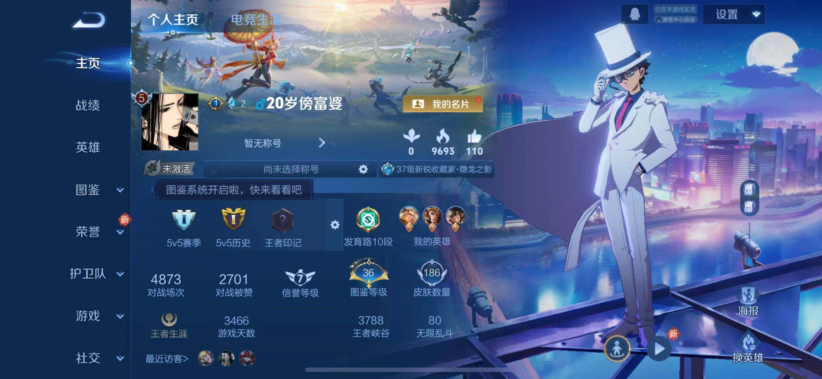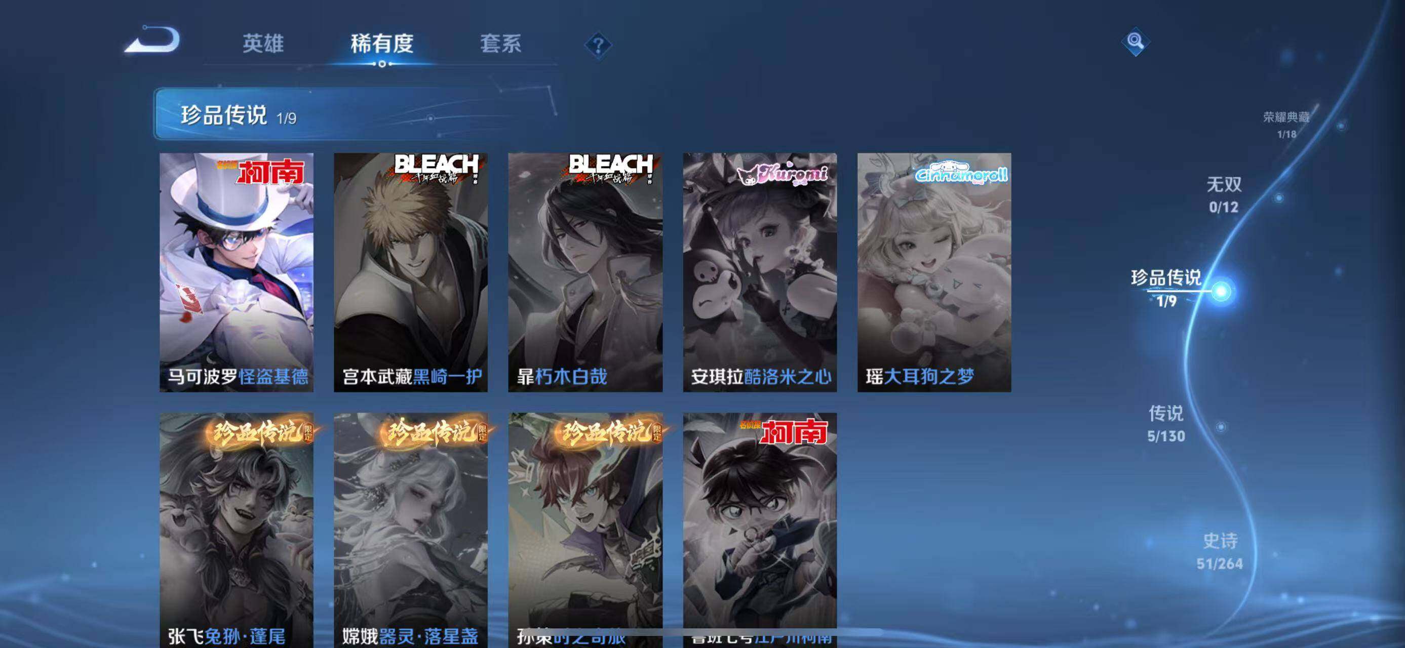 - [11606679]V8 1典藏 3珍品传说 17传说 76英雄 84皮肤 可修改实名 优质装备:最初的交响(伽罗典藏),江户川柯南,怪盗基德,黄金狮子座,乞巧织情,超时空战士-狄仁杰,燃星之曲,记忆之芯(机甲兔),澜逐花归海,玄雷天君 珍品传说:时之奇旅-孙策 传说皮:九山相柳,云诺千山,星之鸣奏,祥瑞亨通,幻光神枪 限定皮:愿照·岁时盈(虞姬年限),愿照·众生和(妲己年限),愿照·千秋盛(女娲年限),陌上桑,烈魂,永曜之星,辉光之辰 史诗皮:鸭鸭历险记-刘禅,狼魂孤将,化蝶舞,龙之律动,雪豹·霜爪,石田雨龙,百相守梦-周瑜,茶境仙,怒海争锋,百相守梦-百里守约,匿光侦查者,末日机甲-莱西奥,时之恋人-孙尚香,水果甜心,幽灵船长,地狱岩魂,龙鼓争鸣,箭羽风息,魅力维加斯