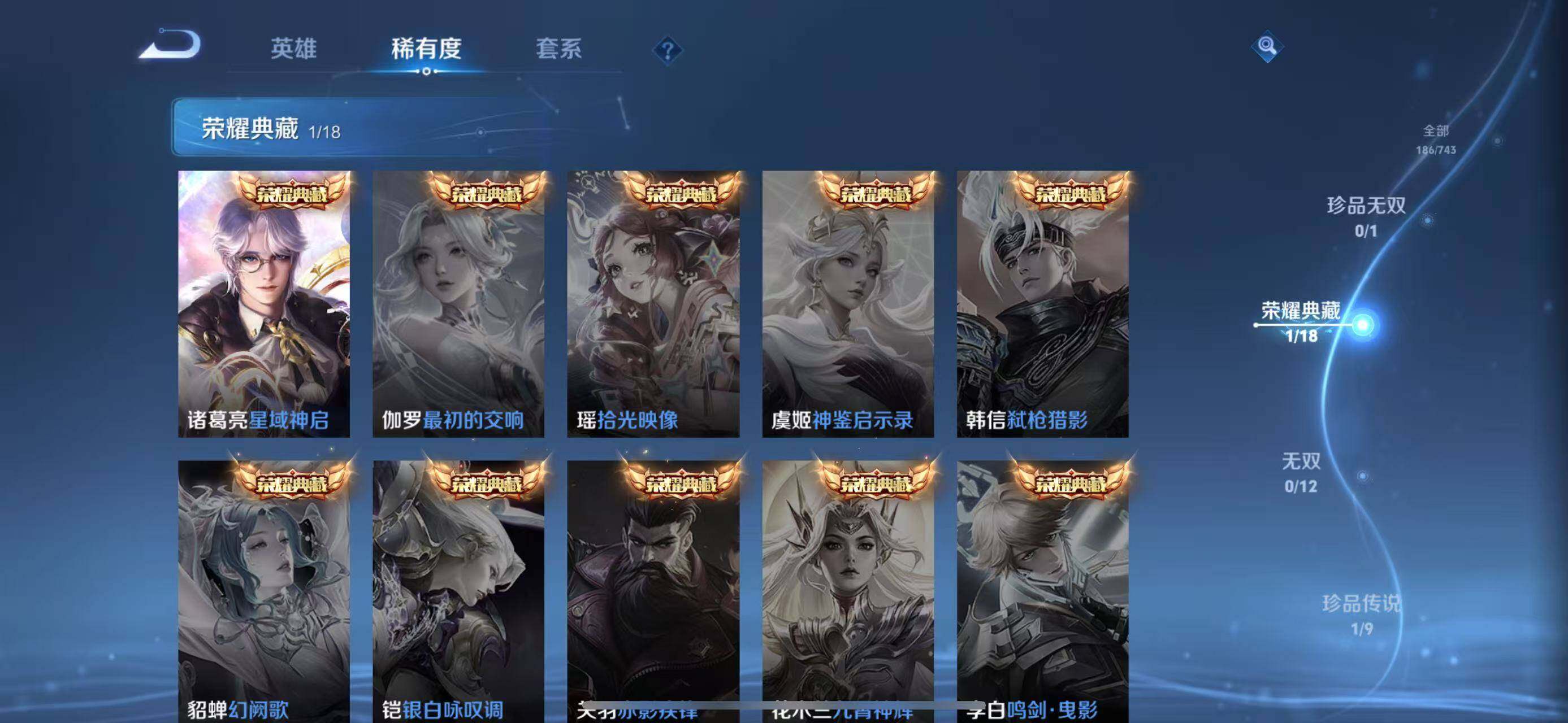 【赛季限定】:芈月重明,夏侯惇朔风刀,曹操烛龙,典韦穷奇,老夫子醍醐杖,张良古海寻踪,牛魔御旌,钟馗驱傩正仪,弈星混沌棋,明世隐疑决卦,裴擒虎擒涛扼浪,狂铁御狮,米莱狄御霄,盾山御銮,鲁班大师探海日志,桑启海盐诗旅,鬼谷子天穹祈灯,刘邦剑破天穹