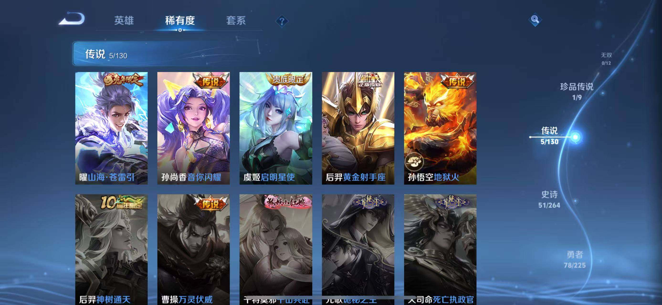 【传说皮肤】:曜山海苍雷引,孙尚香音你闪耀,虞姬启明星使,后羿黄金射手座,孙悟空地狱火
