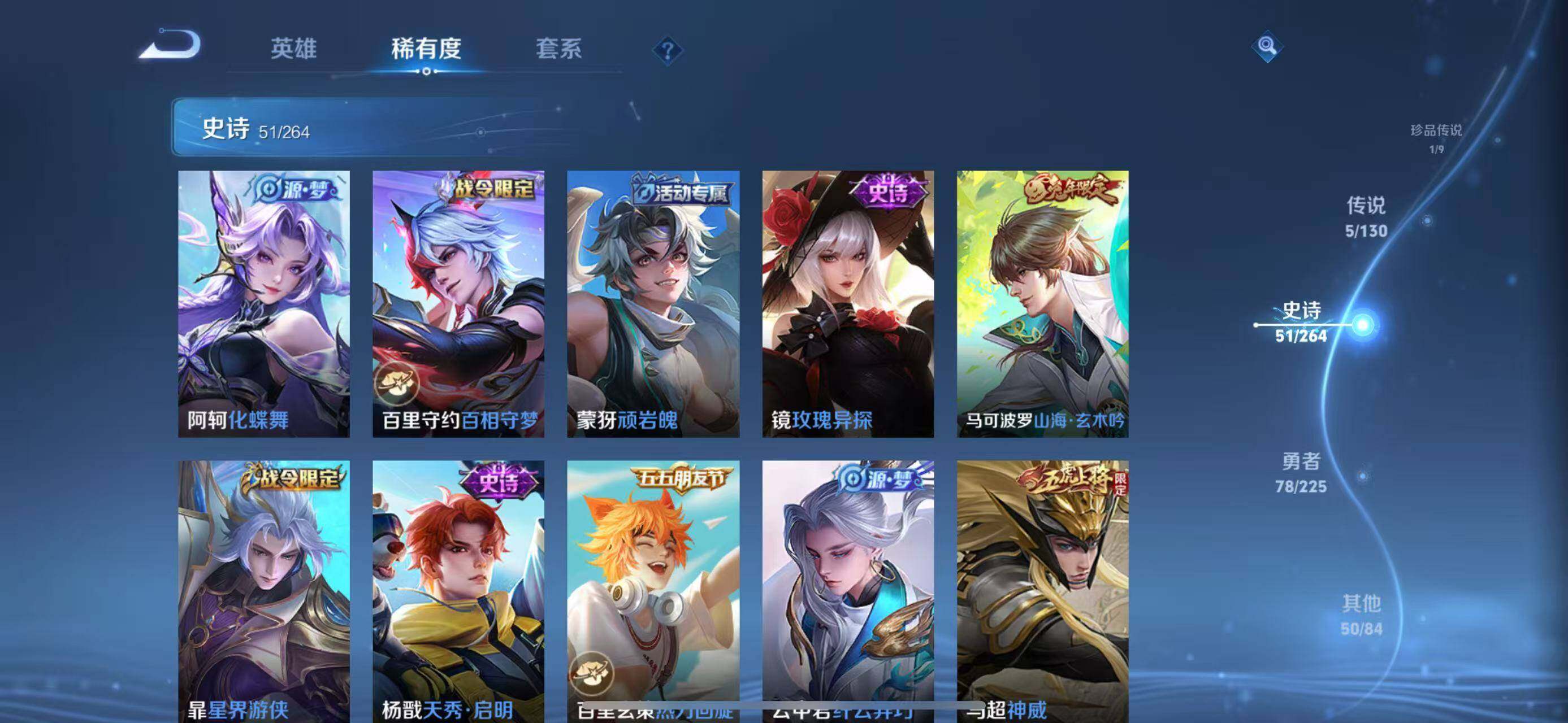 【史诗皮肤】:露娜紫霞仙子,赵云皇家上将,赵云未来纪元,貂蝉圣诞恋歌,王昭君偶像歌手,狄仁杰魔术师,宫本武藏鬼剑武藏,孙尚香水果甜心,嬴政摇滚巨星,墨子金属风暴,吕布圣诞狂欢,曹操幽灵船长,李白千年之狐,张飞乱世虎臣,韩信白龙吟,关羽冰锋战神,貂蝉逐梦之音,孙悟空至尊宝,花木兰水晶猎龙者,夏侯惇乘风破浪,兰陵王暗隐猎兽者,诸葛亮黄金分割率,甄姬游园惊梦,雅典娜冰冠公主,花木兰青春决赛季,百里守约特工魅影,铠曙光守护者,李元芳逐浪之夏,白起星夜王子,杨玉环遇见飞天,嬴政白昼王子,孙策猫狗日记,大乔猫狗日记,百里守约朱雀志,孙悟空大圣娶亲,花木兰瑞麟志,伽罗箭羽风息,狄仁杰鹰眼统帅,公孙离无限星赏官,娜可露露晚萤,韩信飞衡,马超神威,云中君纤云弄巧,百里玄策热力回旋,杨戬天秀启明,暃星界游侠,马可波罗