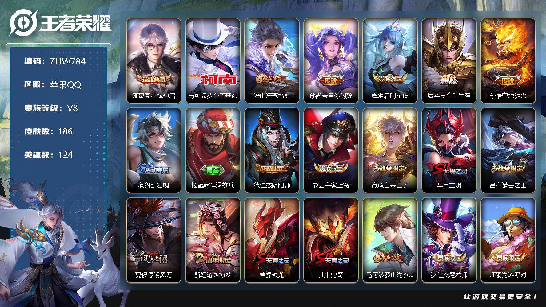 [12950620]苹果Q-V8-尊贵铂金I段位-124英雄-186皮肤-1典藏-1珍品传说-5传说-51史诗