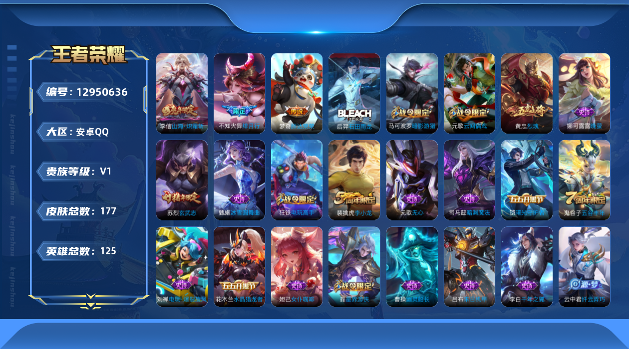 [12950636]【特价急出/详情看图】安卓Q-V0-荣耀黄金I段位-125英雄-177皮肤-3传说-60史诗