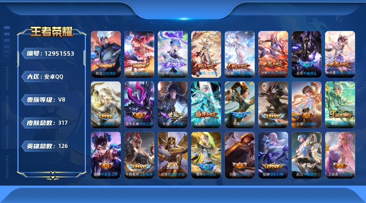 [12951553]【特价急出/详情看图】:安卓Q-V8-至尊星耀III段位-126英雄-317皮肤-2典藏-1无双-24传说-100史诗