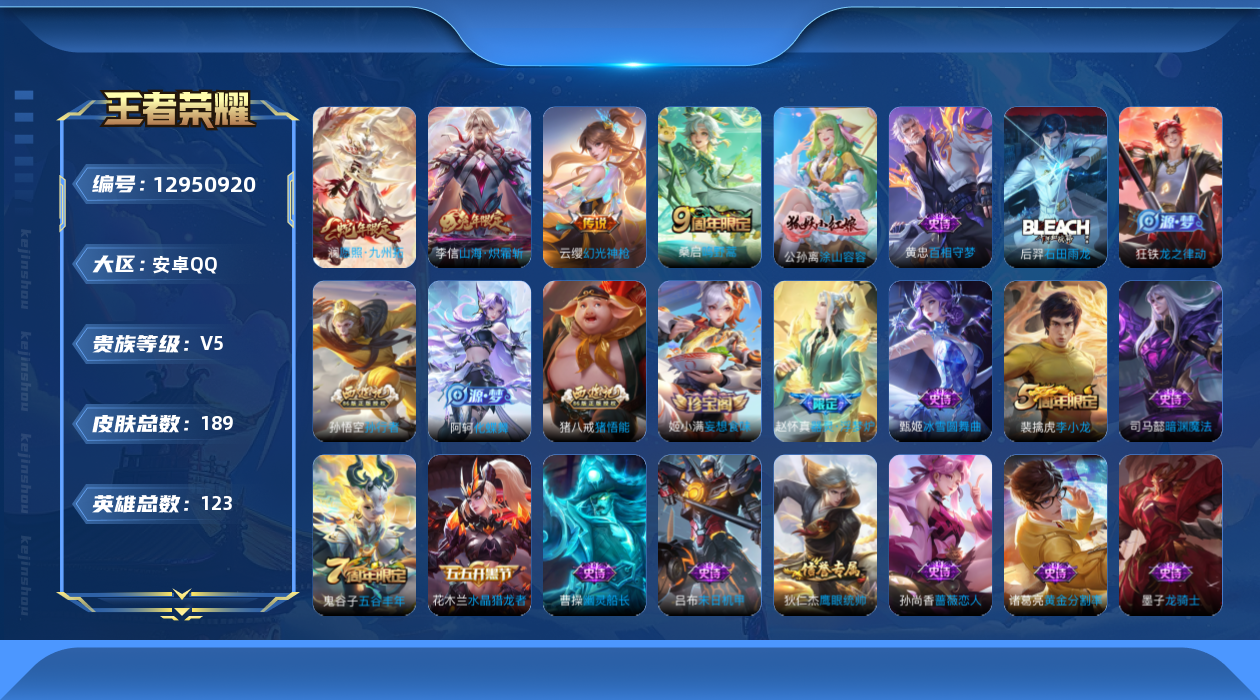 - [11882783]V7 1典藏 1珍品传说 12传说 125英雄 339皮肤 可修改实名 优质装备:鸣剑·曳影,怪盗基德,黄金射手座,云鹰飞将(小将军),黄金白羊座,久胜战神,一念神魔,淬星耀世,超时空战士-狄仁杰,山海·炽霜斩(李信年限) 珍宝阁皮:胡桃夹子,优雅恋人,蔷薇恋人 限定皮:愿照·岁时盈(虞姬年限),逐霄战戟,鸣野蒿,至尊宝,魔法小厨娘,时雨天司(水龙头),遇见飞天,高山流水,怒海麟威,降魔,五谷丰年,梁祝,逐梦之音,李小龙,孙行者,神器·万象笔,山海·玄木吟(马可年限) 史诗皮:鸭鸭历险记-刘禅,器灵·浮梦炉,化蝶舞,星界战将,龙之律动,茶境仙,怒海争锋,蒙犽顽岩魄,上官婉儿群星魔术团,蔬乡物语(鲁班七号),百相守梦-黄忠,织梦人,黄金分割率,特工魅影,千年之狐,江河有灵,魅语,百解令(蒙犽),高渐离燃音魔法,蒙恬荣光圣徽,冰冠公主,偶像歌手,电玩·爆裂旋风,百相守梦(刘备),龙骑士(小龙虾),末日机甲-吕布,猫狗日记-孙策,乱世虎臣,节奏热浪,修罗,女仆咖啡,摇滚巨星,水果甜心,绅士熊喵,星夜王子,心灵骇客,功夫厨神,德古拉伯爵,暗隐猎兽者,幽灵船长,鬼剑武藏,心灵战警,地狱岩魂,纤云弄巧,拒霜思,乘风破浪,逐浪之夏,水晶猎龙者,曙光守护者,热力回旋,箭羽风息,金属风暴,原初追逐者,圣诞狂欢,圣诞恋歌,鹰眼统帅,王者之锤,魅力维加斯,黎明之约,赏金猎手,无心,未来纪元-赵云