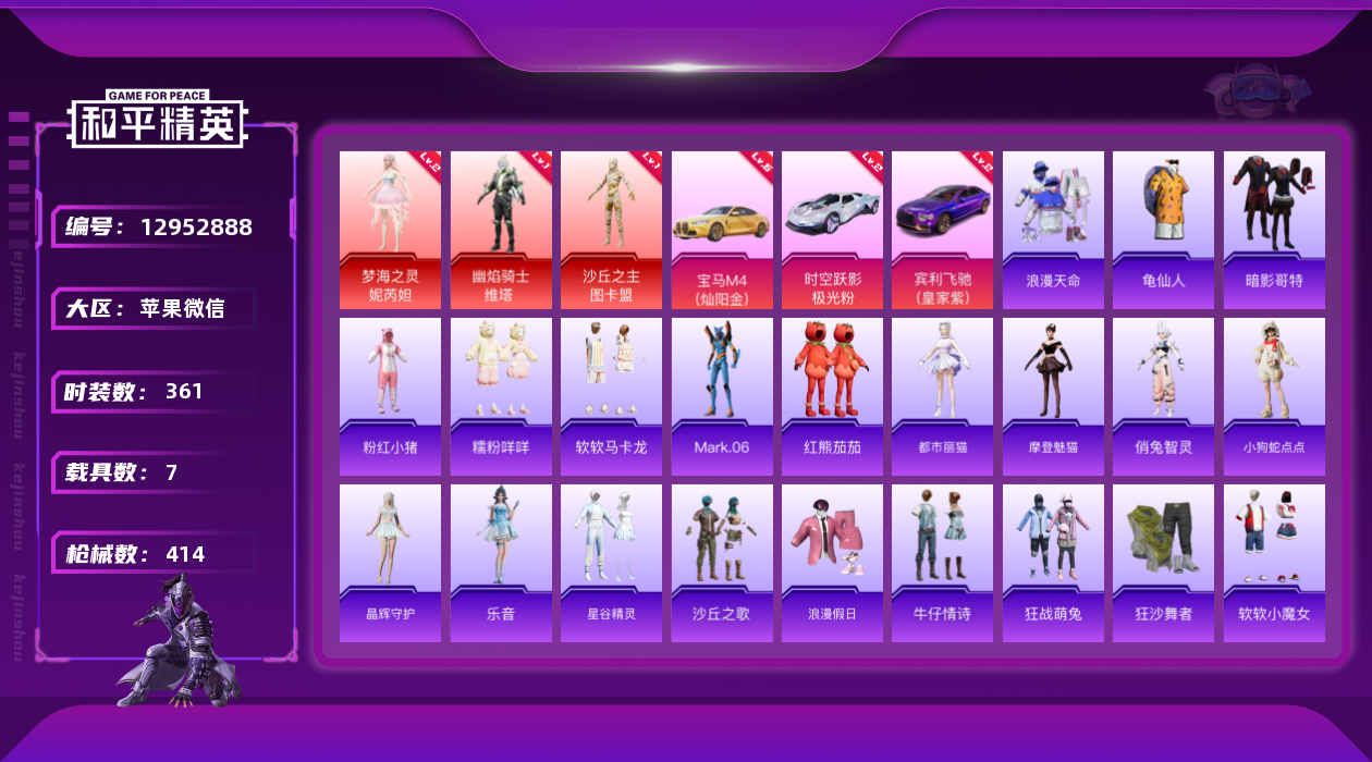 - PX_2074554- 安卓手Q-11王牌印记-13粉装-19特效枪-3载具-110577热力值-194套装-314枪皮-6卓越印记-2传奇印记 【13粉装】,梦幻火箭,雪月幻音,荧海星豚,白勺歌姬,傲傲奶龙,时空协奏·回响,飒粉甜心,月影灵韵,智能音符,莲影清波,幻影战神,烟云彩露,呆萌星弥 【19特效枪】AKM-魔法神域-3级 AKM-绿萝繁花-5级 SCAR-L-锦绣绵绵-5级 SCAR-L