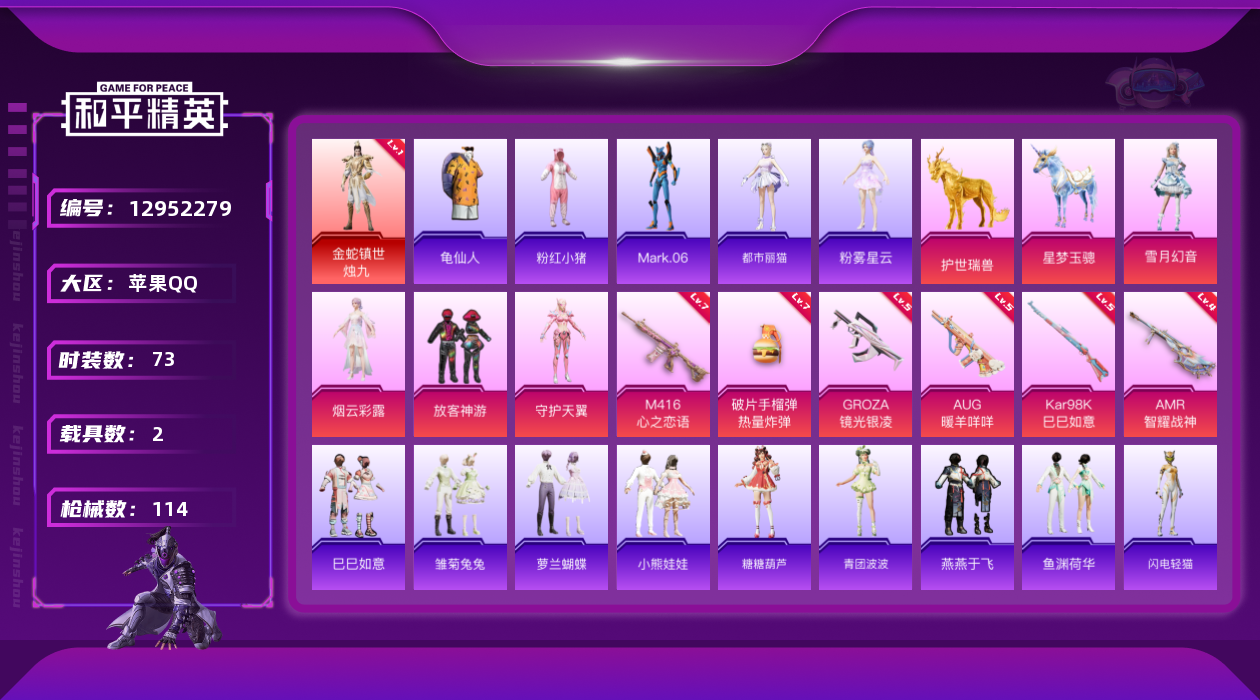 [12952279]素材身法号/地铁满天赋【特价急出/详情看图】:苹果 手Q-1神装-4粉装-6特效枪-2载具-2粉色飞行器-3.7w热力值-4王牌印记-73套装-114枪皮【红色神装等级】:金蛇镇世-烛九(一级)【热门品类】:套装-派对舞王,套装-深海小丑鱼,套装-龟仙人,套装-粉红小猪,角色-Mark.06【粉色载具】:星梦玉骢,护世瑞兽【粉色套装】:粉装-放客神游,角色-烟云彩露,角色-守护天翼,粉装-雪月幻音【粉色枪皮等级】:M416-心之恋语(七级),GROZA-镜光银凌(五级),AUG-暖羊咩咩(五级),Kar98K-巳巳如意(五级),AMR-智耀战神(四级),破片手榴弹-热量炸弹(七级)【粉色飞行器】:深渊漩涡飞行器,圣域金龙飞行器