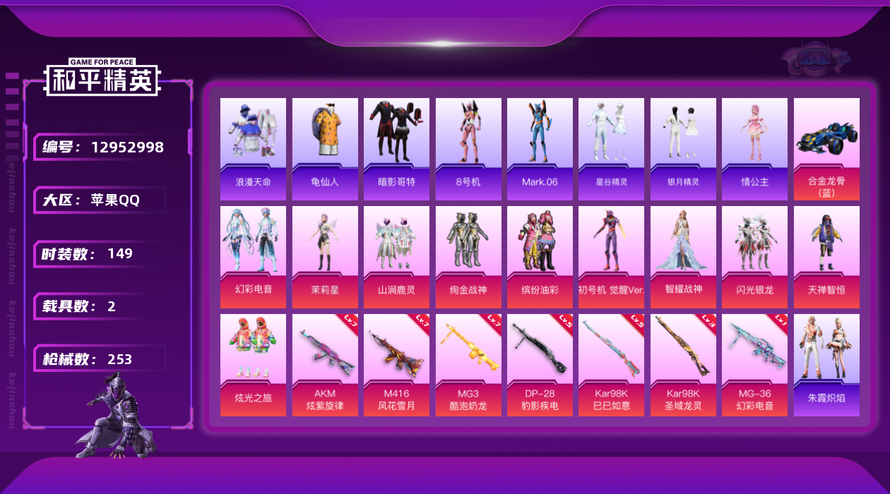 - PX_2081553-实名: 可修改 时装数: 569 载具数: 4 枪械数: 242 战备数: 169 神级装扮: 金蛇镇世-烛九【3级】 热门装扮: 万圣娃娃,银刃赛罗,洛天依,炫光之旅,暗夜魅影,宙之时溯,星云暗核,千金淑猫,星穹咏叹调 载具: 赤兔,照夜玉狮子,护世瑞兽,辉羽雀灵自行车 稀有枪皮: MG3洛神天依【7级】,M416风花雪月【7级】,M249蓝莓炮弹【7级】,Kar98k绿意