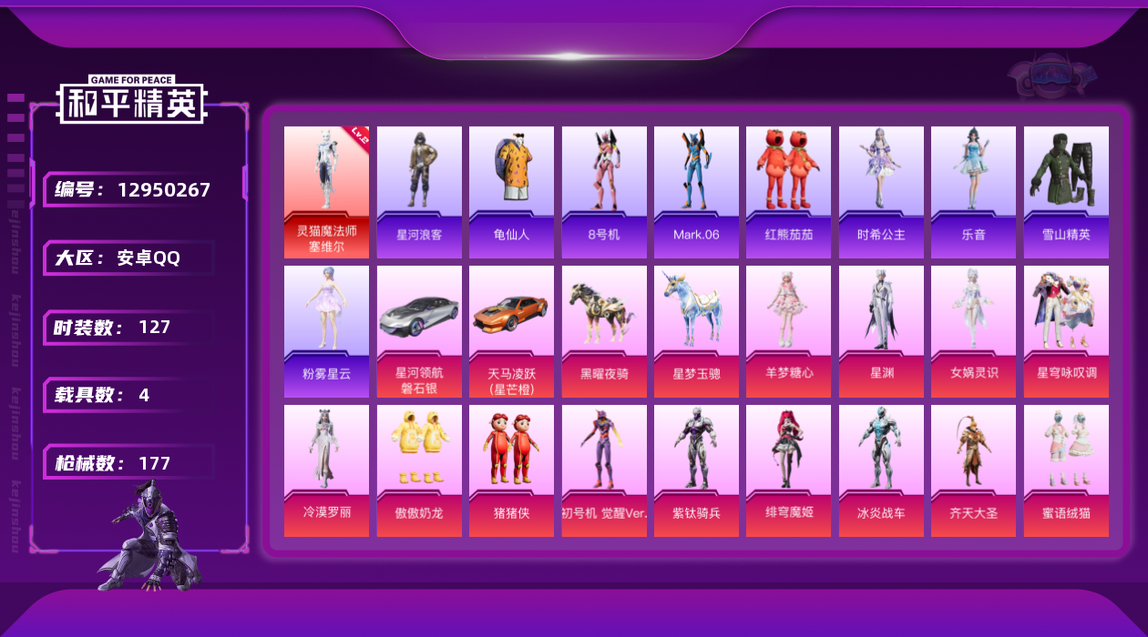 - [9891028]实名: 可修改 时装数: 726 载具数: 2 枪械数: 275 战备数: 178 热门装扮: 奇异狩猎者,梦幻火箭(新101),甜心巧克力,呆萌铁蟹,数码大师,怪诞乔克,深海小丑鱼,宝贝奶油派,天使彩虹糖,放客神游,迅捷狂鲨,鹰眼刺客,智能音符,缤纷油彩,都市猎人,精灵娃娃,甜梦小狐,筑梦精灵,寒光使者,冰川红玫,恶魔喵喵,胖达团团,心之回忆,赤蝎幽灵,派对舞王,仲夏莫吉托,白勺歌姬,闲梦青缨,烟云彩露,美雪,初号机 觉醒Ver.,金丰海韵,星穹咏叹调 载具: 合金龙骨(蓝),星梦玉骢 稀有枪皮: M762甜蜜誓约,M416五爪金龙,M416心之恋语,AUG星之彼岸,UMP45相思残雪,AKM梦之光华,SCAR-L机甲封神,M417第五大道,平底锅仲夏莫吉托,AUG超新星,破片手榴弹秋玉花灯,Kar98K-巳巳如意