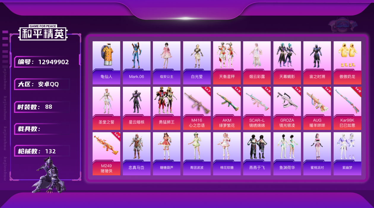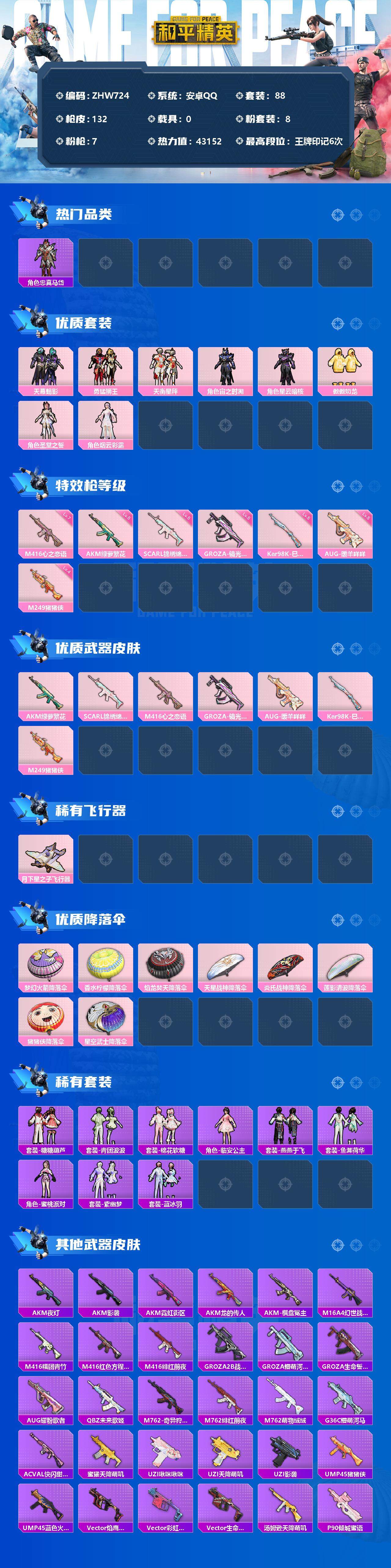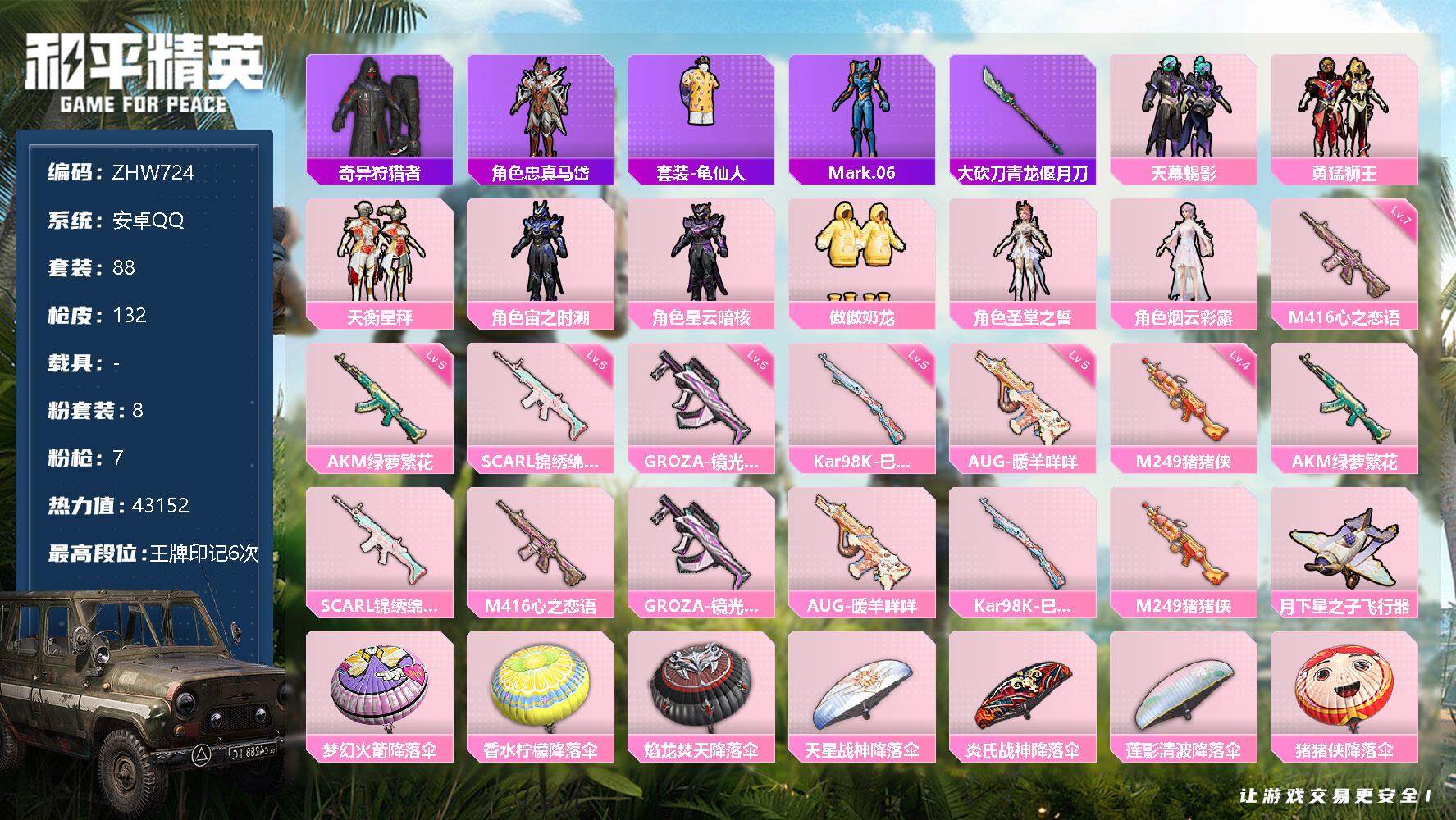 [12949902]双游戏带王者:45皮肤2传说-8粉装-7特效枪-4.2w热力值-6印记-84套装-131枪皮!!! 【热门品类】:套装-奇异狩猎者,角色-忠真马岱,套装-龟仙人,角色-Mark.06,大砍刀-青龙偃月刀 【粉色套装】:粉装-天幕蝎影,粉装-勇猛狮王,粉装-天衡星秤,角色-宙之时溯,角色-星云暗核,粉装-傲傲奶龙,角色-圣堂之誓,角色-烟云彩露 【粉色枪皮等级】:AKM-绿萝繁花(五级),SCAR-L-锦绣绵绵(五级),M416-心之恋语(七级),GROZA-镜光银凌(五级),AUG-暖羊咩咩(五级),Kar98K-巳巳如意(五级),M249-猪猪侠(四级) 【粉色枪皮】:AKM-绿萝繁花,SCAR-L-锦绣绵绵,M416-心之恋语,GROZA-镜光银凌,AUG-暖羊咩咩,Kar98K-巳巳如意,M249-猪猪侠 【粉色飞行器】:月下星之子飞行器 【粉色降落伞】:梦幻火箭降落伞,香水柠檬降落伞,焰龙焚天降落伞,天星战神降落伞,炎氏战神降落伞,莲影清波降落伞,猪猪侠降落伞,星空武士降落伞 【稀有套装】:套装-龟仙人,套装-糖糖葫芦,套装-青团波波,套装-棉花软糖,角色-临安公主,套装-燕燕于飞,套装-鱼渊荷华,角色-蜜桃派对,套装-紫幽梦,套装-蓝冰羽 【稀有枪皮】:AKM-夜灯,AKM-影袭,AKM-霓虹街区,AKM-龙的传人,AKM-棋盘冕主,M16A4-幻世战舞者,M416-糯团青竹,M416-红色方程式,M416-绯红前夜,GROZA-2B战斗服款,GROZA-懵萌河马,GROZA-生命誓言,AUG-耀粉歌者,QBZ-未来歌姬,M762-奇异狩猎者,M762-绯红前夜,M762-萌物绒绒,G36C-懵萌河马,AC-VAL-快闪甜心,蜜獾-天降萌叽,UZI-啾咪啾咪,UZI-天降萌叽,UZI-影袭,UMP45-猪猪侠,UMP45-蓝色火焰,Vector-焰鹰斗篷,Vector-彩虹符号,Vector-生命誓言,汤姆逊-天降萌叽,P90-倾城蜜语,P90-快闪甜心,Kar98K-彩虹符号,M24-影袭,AWM-焰鹰斗篷,AWM-超新星,SKS-迅猛狂鲨,VSS-彩虹符号,VSS-星之彼岸,莫辛纳甘-懵萌河马,AMR-超新星,M417-惊鸿侠骨,M417-猪猪侠,MK20-H-快闪甜心,MK20-H-莲影清波,M200-惊鸿侠骨,M200-祥瑞锦鲤,S686-奇异狩