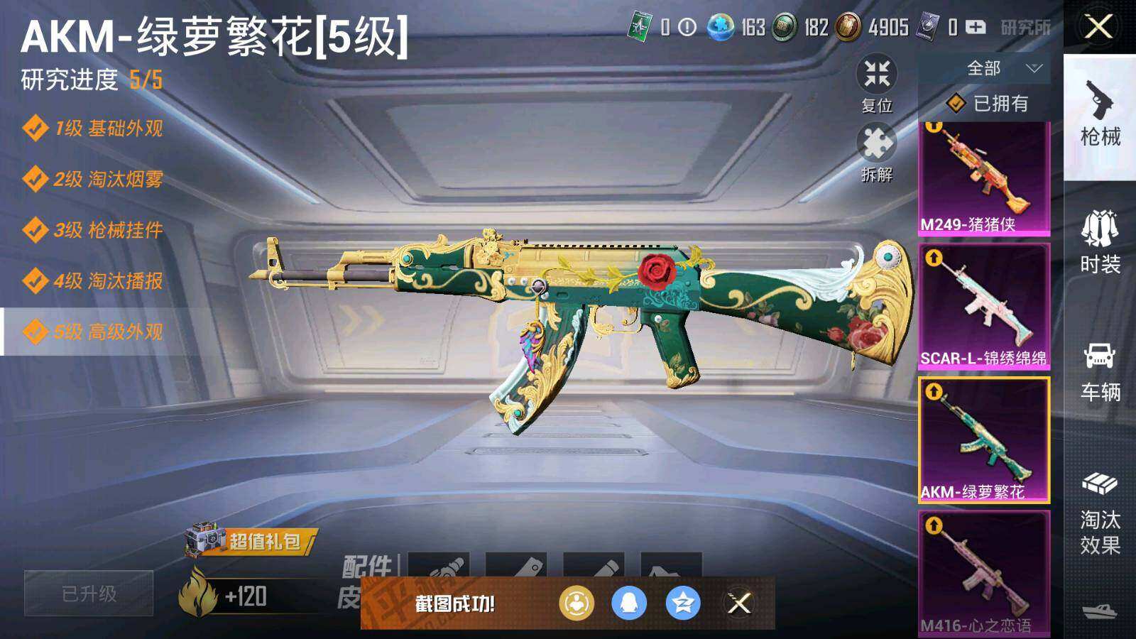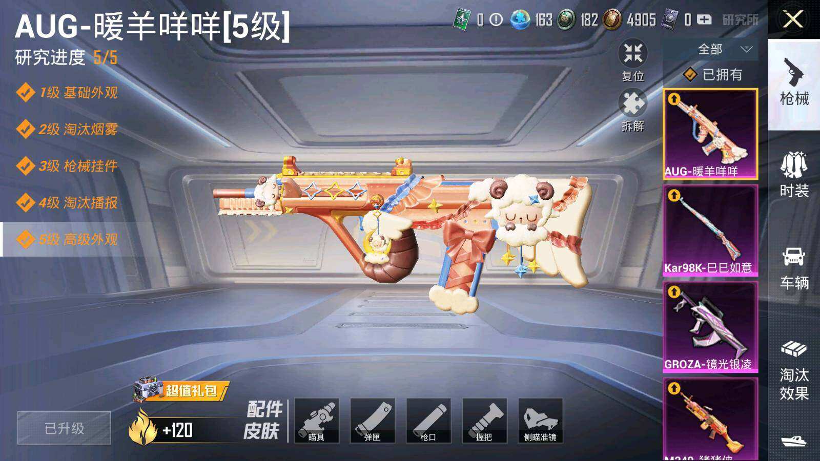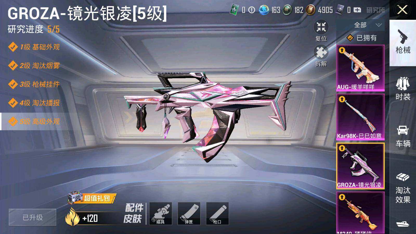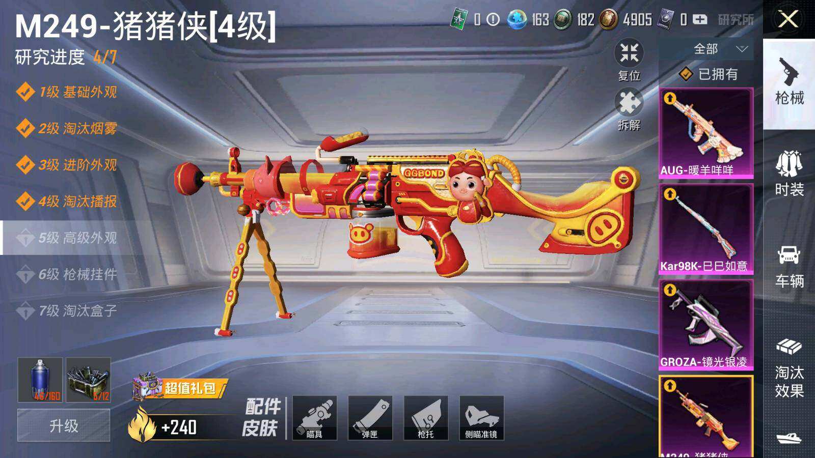 【粉色枪皮等级】:AKM-绿萝繁花(五级),SCAR-L-锦绣绵绵(五级),M416-心之恋语(七级),GROZA-镜光银凌(五级),AUG-暖羊咩咩(五级),Kar98K-巳巳如意(五级),M249-猪猪侠(四级)