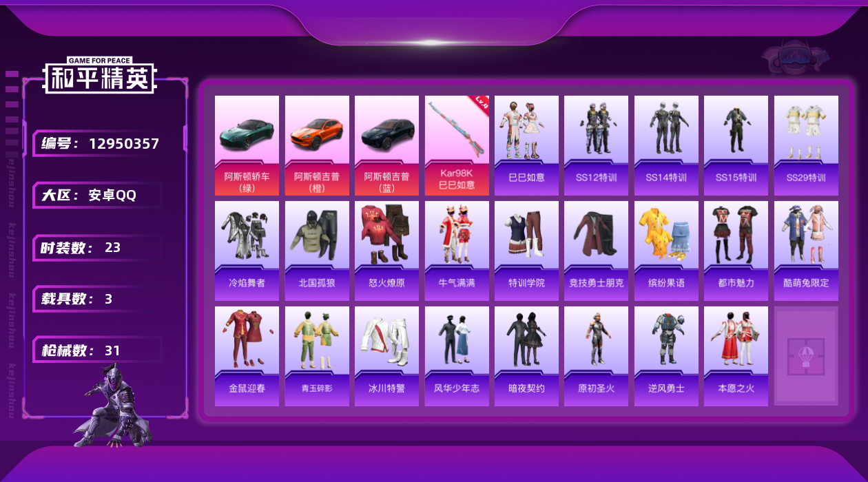 [12950357]【特价急出/详情看图】:安卓 手Q-1特效枪-3载具-1.1w热力值-2王牌印记-23套装-31枪皮【粉色载具】:阿斯顿马丁DBS(绿),阿斯顿马丁DBX(橙),阿斯顿马丁DBX(蓝)【粉色枪皮等级】:Kar98K-巳巳如意(四级)