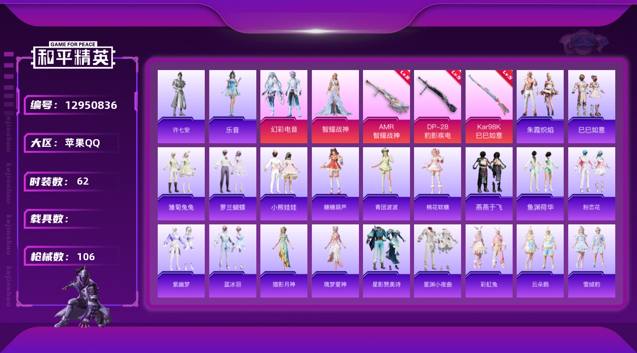 [12950836]地铁满天赋【特价急出/详情看图】:苹果 手Q-2粉装-4特效枪-3w热力值-4王牌印记-62套装-106枪皮【粉色套装】:角色-智耀战神,粉装-幻彩电音【粉色枪皮等级】:Kar98K-巳巳如意(五级),Mk14-甜梦熊击(五级),AMR-智耀战神(六级),DP-28-豹影疾电(五级)