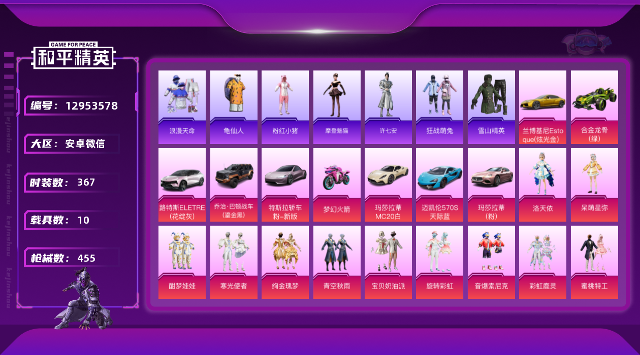 [12953578]素材身法号/地铁满天赋【特价急出/详情看图】:安卓 微信-52粉装-14特效枪-10载具-17粉色飞行器-20.6w热力值-24王牌印记-367套装-455枪皮【热门品类】:粉装-梦幻火箭,粉装-音爆索尼克,粉装-缤纷油彩,套装-浪漫天命,套装-小丑鱼,套装-SS1特训,套装-龟仙人,套装-潮萌小黄鸭,套装-粉红小猪,小恶魔头饰,熔岩游骑兵面罩,熔岩游骑兵连帽夹克【粉色载具】:特斯拉Roadster(沁心粉),兰博基尼Estoque(炫光金),路特斯ELETRE(花绽灰),玛莎拉蒂MC20(星石白),玛莎拉蒂Ghibli(粉),乔治巴顿战车(鎏金黑),迈凯伦570S(天际蓝),合金龙骨(绿),双人摩托-梦幻火箭,僚机-萌兔起飞【粉色套装】:粉装-深海曼妙,粉装-宝贝奶油派,粉装-天使彩虹糖,粉装-蝶舞迷情,粉装-梦幻火箭,粉装-缤纷油彩,粉装-PEL轰鸣竞梦者,粉装-甜蜜誓约,粉装-极致幻想,粉装-幻彩马卡龙,粉装-草莓生巧,粉装-冰霜白皇,粉装-炙焰红王,粉装-香水柠檬,粉装-王牌四分卫,粉装-星之彼岸,粉装-馨动时刻,粉装-烈焰拳霸,粉装-蜜桃特工,粉装-暗夜玫瑰,粉装-彩虹鹿灵,粉装-山涧鹿灵,角色-洛天依,粉装-花影阑珊,粉装-俏雪含霜,粉装-黄伞悠悠,粉装-黑伞漫漫,粉装-海渊国主,粉装-绚金瑰梦,粉装-流星咚咚,粉装-酣梦娃娃,粉装-庄周梦蝶,粉装-橘柚倾心,粉装-傲雪凌霜,粉装-旋转彩虹,粉装-冰川幽秘,粉装-冰川红玫,粉装-寒光使者,粉装-青空秋雨,角色-歌者泠鸢,粉装-音爆索尼克,粉装-第五大道,粉装-纯珍童话,粉装-瑰丽时代,角色-白勺歌姬,角色-呆萌星弥,角色-小可学妹,粉装-闲梦青缨,粉装-萌物绒绒,角色-烟云彩露,角色-智耀战神,角色-绯穹魔姬【粉色枪皮等级】:AKM-星际浪客(七级),AKM-白勺歌姬(五级),M16A4-葫芦兄弟(七级),SCAR-L-机甲封神(七级),M416-心之恋语(七级),AUG-星之彼岸(七级),M762-甜蜜誓约(七级),汤姆逊-怪笑疯兔(五级),Kar98K-巳巳如意(五级),M417-第五大道(一级),S12K-海渊国主(二级),DP-28-暗夜鎏金(六级),DP-28-豹影疾电(五级),MG3-洛神天依(七级)【粉色飞行器】:深海曼妙飞行器,春暖花开飞行器,梦幻火箭飞行器,神秘黑猫飞行器,马卡龙飞行器