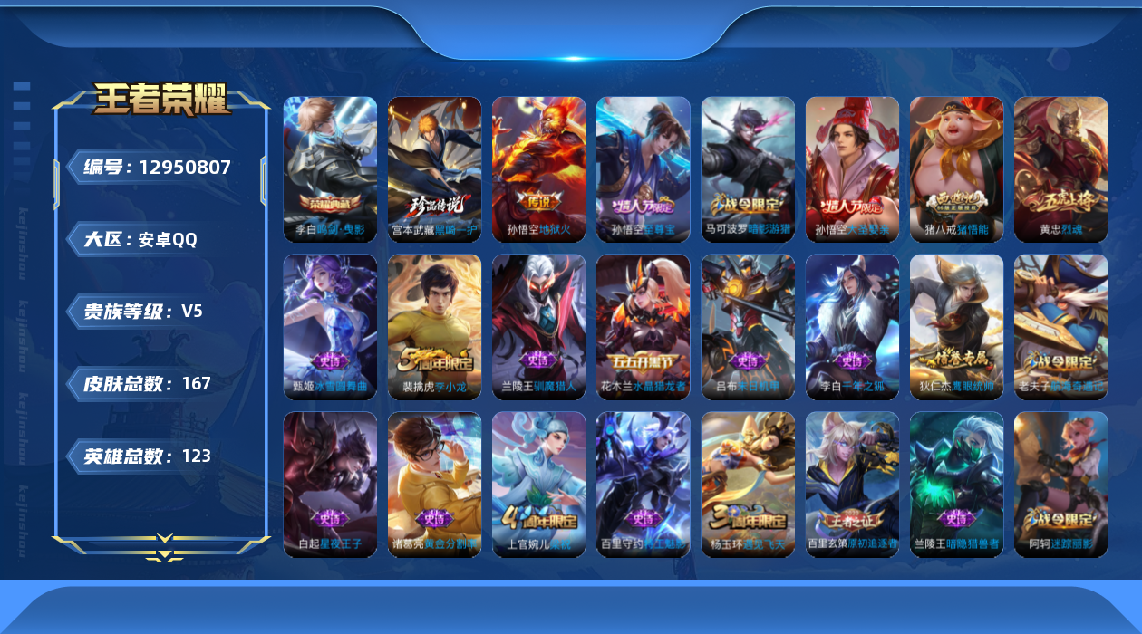 [12950807]【特价急出/详情看图】:安卓Q-V5-至尊星耀I段位-123英雄-167皮肤-1典藏-1珍品传说-1传说-33史诗