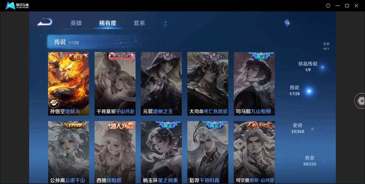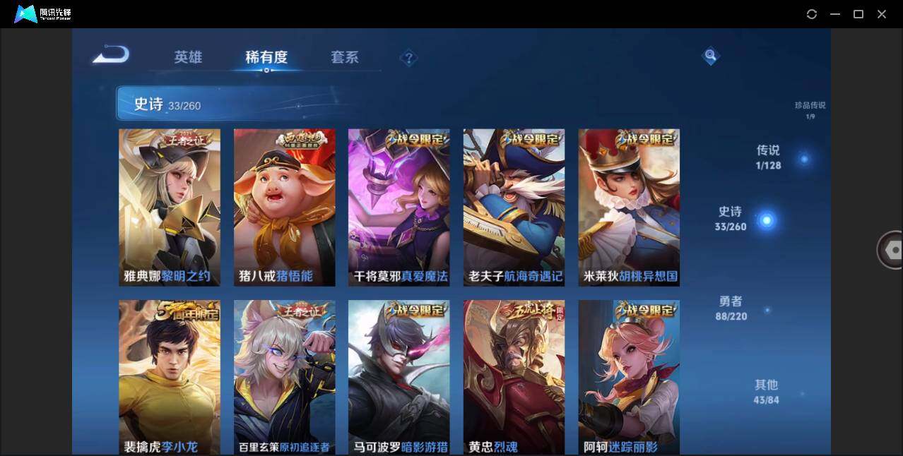 - [12091931]V8 2典藏 1无双 1珍品传说 18传说 124英雄 329皮肤 可修改实名 优质装备:鸣剑·曳影,全息碎影(猴子典藏),碎月剑心(李白无双),云鹰飞将(小将军),久胜战神,一念神魔,末日机甲-孙尚香(绿蚂蚱),时之恋人-刘备(电焊工),淬星耀世,挚爱之约,山海·炽霜斩(李信年限),妄想实况,澜逐花归海 珍品传说:兔狲·蓬尾 传说皮:幻光神枪 珍宝阁皮:万物之道,优雅恋人,蔷薇恋人,玩趣恶龙 限定皮:鸣野蒿,至尊宝,凤求凰(白切鸡),梅西,武陵仙君(小桃花),傲雪梅枪,时雨天司(水龙头),神威(电光马子),飞衡(韩信年限),高山流水,诗剑行,匿光决锋者,五谷丰年,梁祝,李小龙,辉光之辰,默契交锋-花木兰,孙行者,一生所爱,大圣娶亲,青春决赛季,枫霜尽,山海·玄木吟(马可年限) 史诗皮:鸭鸭历险记-刘禅,器灵·浮梦炉,星界战将,龙之律动,石田雨龙,茶境仙,破空之剑,决胜骁骑,织梦人,紫霞仙子,苍穹之光,电玩小子(小书包),白龙吟,黄金分割率,特工魅影,千年之狐,永昼,江河有灵,魅语,蒙恬荣光圣徽,无限星赏官,冰冠公主,偶像歌手,暗夜猫娘,末日机甲-吕布,猫狗日记-孙策,猫狗日记-大乔,乱世虎臣,节奏热浪,修罗,女仆咖啡,摇滚巨星,水果甜心,天才门将,星夜王子,心灵骇客,功夫厨神,德古拉伯爵,暗隐猎兽者,幽灵船长,鬼剑武藏,心灵战警,乐园奇幻夜,舞动绿茵,地狱岩魂,纤云弄巧,缤纷独角兽,乘风破浪,逐浪之夏,月团寄思,水晶猎龙者,金属风暴,原初追逐者,圣诞狂欢,圣诞恋歌,鹰眼统帅,暗夜贵公子,魅力维加斯,黎明之约,无心,未来纪元-赵云