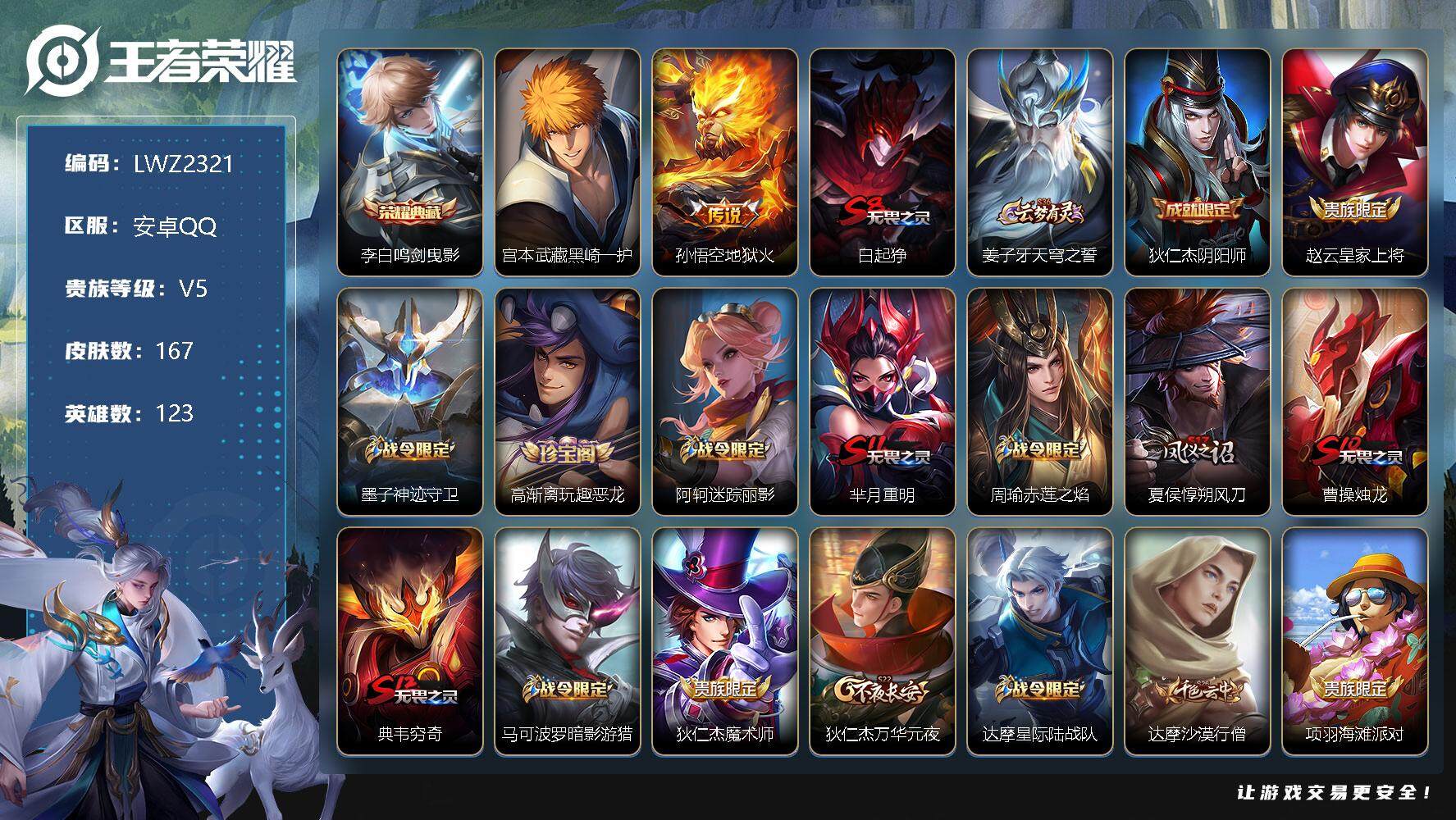 [12950807]【特价急出/详情看图】:安卓Q-V5-至尊星耀I段位-123英雄-167皮肤-1典藏-1珍品传说-1传说-33史诗 【荣耀典藏】:李白鸣剑曳影 【珍品传说】:宫本武藏黑崎一护 【传说皮肤】:孙悟空地狱火 【限定皮肤】:白起狰,姜子牙天穹之誓,狄仁杰阴阳师,赵云皇家上将,墨子神迹守卫,高渐离玩趣恶龙,阿轲迷踪丽影,芈月重明,周瑜赤莲之焰,夏侯惇朔风刀,曹操烛龙,典韦穷奇,马可波罗暗影游猎,狄仁杰魔术师,狄仁杰万华元夜,达摩星际陆战队,达摩沙漠行僧,项羽海滩派对,老夫子醍醐杖,老夫子航海奇遇记,程咬金演武夺筹,刘邦夺宝奇兵,兰陵王驯魔猎人,兰陵王金庭之子,孙悟空至尊宝,孙悟空大圣娶亲,牛魔御旌,后羿圣弓游侠,李元芳银河之约,李元芳云中旅人,钟馗驱傩正仪,杨玉环遇见飞天,干将莫邪真爱魔法,雅典娜黎明之约,太乙真人饕餮,鬼谷子原初探秘者,黄忠烈魂,苏烈千军破阵,百里玄策原初追逐者,弈星混沌棋,沈梦溪星空之诺,沈梦溪大漠名商,明世隐疑决卦,裴擒虎李小龙,裴擒虎擒涛扼浪,狂铁御狮,米莱狄御霄,米莱狄胡桃异想国,盾山御銮,猪八戒西部大镖客,猪八戒猪悟能,上官婉儿梁祝,鲁班大师探海日志,张良古海寻踪,鬼谷子天穹祈灯 【年限皮肤】:黄忠烈魂 【赛季限定】:白起狰,芈月重明,夏侯惇朔风刀,曹操烛龙,典韦穷奇,狄仁杰万华元夜,达摩沙漠行僧,老夫子醍醐杖,程咬金演武夺筹,兰陵王金庭之子,张良古海寻踪,牛魔御旌,李元芳云中旅人,钟馗驱傩正仪,雅典娜黎明之约,太乙真人饕餮,鬼谷子原初探秘者,苏烈千军破阵,百里玄策原初追逐者,弈星混沌棋,沈梦溪大漠名商,明世隐疑决卦,裴擒虎擒涛扼浪,狂铁御狮,米莱狄御霄,盾山御銮,鲁班大师探海日志,鬼谷子天穹祈灯,姜子牙天穹之誓 【战令限定】:墨子神迹守卫,阿轲迷踪丽影,周瑜赤莲之焰,马可波罗暗影游猎,达摩星际陆战队,老夫子航海奇遇记,刘邦夺宝奇兵,兰陵王驯魔猎人,后羿圣弓游侠,李元芳银河之约,干将莫邪真爱魔法,沈梦溪星空之诺,米莱狄胡桃异想国,猪八戒西部大镖客 【史诗皮肤】:赵云皇家上将,甄姬冰雪圆舞曲,王昭君偶像歌手,狄仁杰魔术师,宫本武藏鬼剑武藏,嬴政摇滚巨星,墨子金属风暴,李白千年之狐,吕布末日机甲,孙悟空至尊宝,花木兰水晶猎龙者,兰陵王暗隐猎兽者,诸葛亮黄金分割率,亚瑟心灵战警,雅典娜冰冠公主,百里守约特工魅影,白起星夜王子,杨玉环遇见飞天,孙悟空大