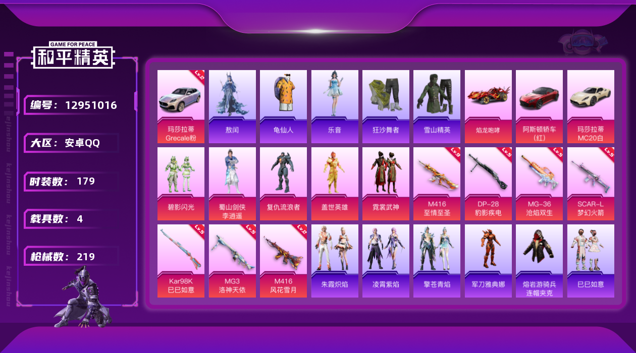 - PX_2087825- 可二次 苹果手Q-10王牌印记-12粉装-4特效枪-1载具-74464热力值-157套装-213枪皮-0卓越印记-0传奇印记 【12粉装】,梦幻火箭,天使彩虹糖,缤纷油彩,蝶舞迷情,狂花道·不知火舞,精灵迷巫,甜蜜誓约,金属狂野,智能音符,圣堂之誓,向日葵,冰川幽秘 【4特效枪】,AKM-炫紫旋律-7级 M416-五爪金龙-7级 Kar98K-伏魔团-7级 AMR-智耀战神