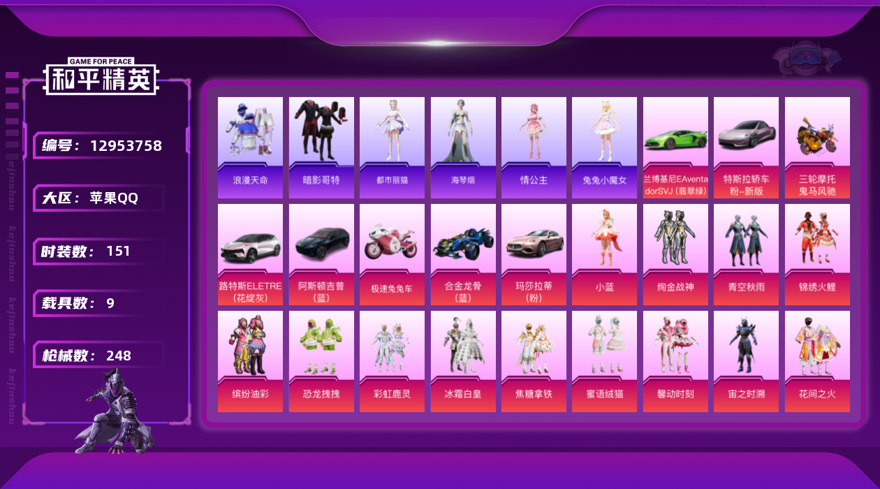 - [11529111]31粉装 6特效枪 1载具 17印记 可二次 可修改实名 身法装备:暗影哥特(红眼罩),冥河战士(老木乃伊),KONE追光队服,萌熊伴侣背包(粉熊背包) 优质装备:冥河战士(老木乃伊),木乃伊套装(老)(冥河战士),兰博基尼Estoque(炫光金),甜心巧克力,萌熊伴侣背包(粉熊背包),M416五爪金龙,SCAR-L梦幻火箭,梦幻火箭(新101)(新火箭少女101粉色套装),宝贝奶油派,天使彩虹糖,放客神游,土曜战麒,金曜白虎,缤纷油彩(猪妹猪脸妹),绚金战神,冰霜白皇,新星烈龙(小白龙),童趣迷兔,AKM梦之光华,馨动时刻,DP-28暗夜鎏金,七级AKM-梦之光华,七级SCAR-L-梦幻火箭,七级M416-五爪金龙,Mk14精灵梦叶罗丽,绯果甜心,Kar98K-巳巳如意 热门装扮:精灵娃娃,酣梦娃娃,岚岚物语,海渊国主,霞光圣骑,寒光使者,暖熊萌萌,傲雪凌霜,音爆索尼克,第五大道,飒粉甜心,呆萌星弥,白勺歌姬,小可学妹,白兰星,闲梦青缨,暖暖奶龙,兔兔白日梦,动感兔斯基,胖达圆圆,胖达团团,萌神柯基,罗小黑,激萌罗小黑,潮萌小黄鸭,万圣娃娃,梦魇先生,好奇恐龙 六级特效枪:六级Mk14-精灵梦叶罗丽 四级特效枪:四级Kar98K-巳巳如意 三级特效枪:三级DP-28-暗夜鎏金 紫色装扮:田园牧歌,轻风白浪,SS22特训,莱茵河畔,SS23特训,幻彩翩翩,灵蜜圈圈,妙红点点,香榭午后,白兰地假日,娇憨猪猪,奶油香芋,樱桃黑巧,夏雨游龙,萌趣咩咩,暖心熊熊,SS21特训,绚烂繁星,熠彩粉晶,SS31特训套装,SS2特训,SS3特训,SS4特训,SS5特训,人气偶像,六六大吉,军械专家,冰原使者,,冰川特警,冷焰舞者,凛冬战士,刚毅裁决者,北国孤狼,千禧之恋,午夜朋克,S5赛事,S3赛事,极速光影,SS30特训套装,云朵鹅,雪绒豹,SS33特训套装,青涩时光,顶瓜瓜,SS20特训,SS14特训,SS19特训,粉团憨憨,软羊咩咩,天籁歌者,瑞龙福将,团圆交子,醒狮腾龙,SS17特训,糖果砰砰,异彩先驱,SS18特训,都市魅力,野性战心,野性战魂,金鼠迎春,长空猛禽,雪山征服者,雪山精英,雷霆特警,霓虹极客,霓虹街区,青年教官,迎春赐吉,风暴特警,缤纷果语,自由不朽乐队,苍影战舞者,荣耀,蓝彩潮人,蓝色守护者,蓝色运动,虎虎生威吉莉,跃动心情,青涩年华,魅力单车,鹤鸣