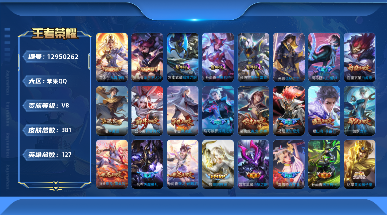 [12950262]【特价急出/详情看图】苹果Q-V8-最强王者段位-127英雄-381皮肤-2典藏-56传说-120史诗