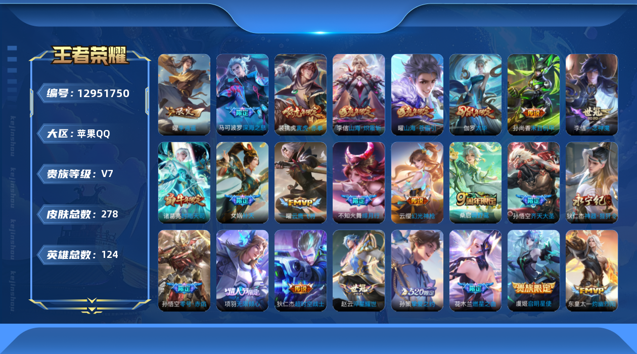 [12951750]苹果Q-V7-最强王者段位-124英雄-278皮肤-0典藏-0珍品无双-0无双-0珍品传说-24传说-79史诗