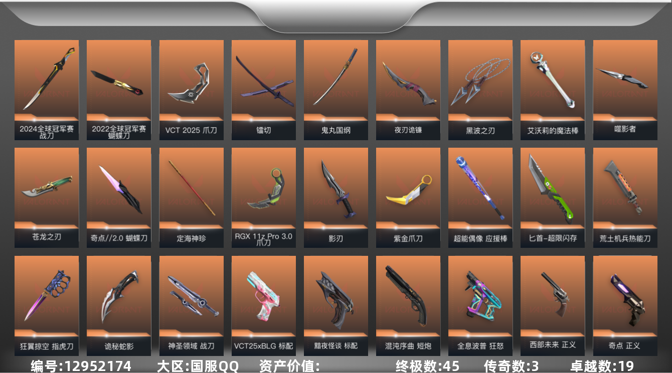[12952174]皮肤资产价值121420 【套装】:2024全球冠军赛套装,2022全球冠军赛套装,VCT 2025 赛季套装,黯夜怪谈套装,般若假面//2.0套装,掠影套装,英雄之选套装 【英雄】:幻棱,炼狱,维斯,暮蝶,钛狐,壹决,铁臂,捷风,雷兹,幽影,不死鸟,贤者,猎枭,蝰蛇,零,芮娜,奇乐,尚勃勒,霓虹,斯凯,夜露,星礈,K/O,海神,盖可,黑梦,钢锁 【近战 武器】:近战武器-2024全球冠军赛 战刀,近战武器-2022全球冠军赛 蝴蝶刀,近战武器-5周年//公测重制版 苍龙之刃,近战武器-奇点//2.0 蝴蝶刀,近战武器-VCT 2025 爪刀,近战武器-紫金爪刀,近战武器-RGX 11z Pro//3.0 爪刀,近战武器-黑波之刃,近战武器-噬影者 簇刃,近战武器-镭切,近战武器-艾沃莉的魔法棒,近战武器-鬼丸国纲,近战武器-超能偶像 应援棒,近战武器-超限闪存 匕首,近战武器-定海神珍,近战武器-荒土机兵 热能刀,近战武器-狂翼掠空 指虎刀,近战武器-夜刃诡镰,近战武器-影刃,近战武器-诡秘蛇影 军刀,近战武器-神圣领域 战刀 【狂徒】:狂徒-洪荒怒焰,狂徒-混沌序曲,狂徒-机动狂飙,狂徒-双城之战,狂徒-塑水宗,狂徒-创·纪元,狂徒-RGX 11z Pro,狂徒-般若假面//2.0,狂徒-冰点凝冻,狂徒-掠影,狂徒-盖亚的复仇,狂徒-日冕雄师,狂徒-紫阙金琅,狂徒-超能偶像,狂徒-荒土机兵,狂徒-诡秘蛇影 【幻影】:幻影-2022全球冠军赛,幻影-2024全球冠军赛,幻影-黯夜怪谈,幻影-侦察力量,幻影-超限闪存,幻影-神圣领域,幻影-聚合之力,幻影-纳米打击,幻影-末日之翼 【戍卫】:戍卫-掠影,戍卫-天界神兵,戍卫-超能偶像,戍卫-浮光跃金,戍卫-逆冲蛮牛,戍卫-月球哨兵,戍卫-折光棱晶 【獠犬】:獠犬-黯夜怪谈,獠犬-般若假面//2.0,獠犬-神圣领域,獠犬-采蜜小蜂队,獠犬-模拟赫兹,獠犬-逆冲蛮牛 【冥驹】:冥驹-堕天遗武,冥驹-掠影,冥驹-荒土机兵,冥驹-模拟赫兹,冥驹-星云暗涌 【飞将】:飞将-黯夜怪谈,飞将-西部未来,飞将-聚合之力,飞将-末日之翼 【莽侠】:莽侠-RGX 11z Pro//3.0,莽侠-超限闪存,莽侠-诡秘蛇影,莽侠-月球哨兵 【战神】:战神-般若假面//2.0,战神-神圣领域,战神-采蜜小蜂队,战神-浮光跃金 【奥丁】:奥丁