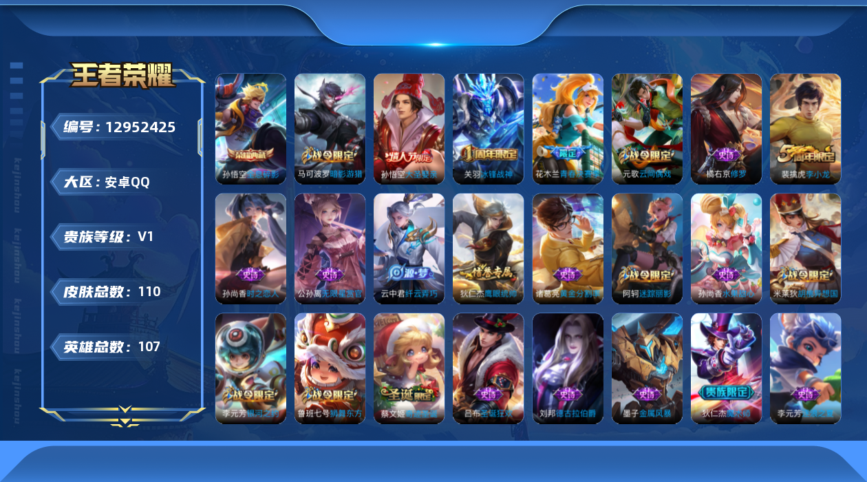 [12952425]【特价急出/详情看图】:安卓Q-V0-秩序白银II段位-106英雄-110皮肤-1典藏-26史诗 【荣耀典藏】:孙悟空全息碎影 【限定皮肤】:狄仁杰阴阳师,赵云皇家上将,墨子神迹守卫,鲁班七号狮舞东方,阿轲迷踪丽影,元歌云间偶戏,马可波罗暗影游猎,狄仁杰魔术师,狄仁杰万华元夜,达摩星际陆战队,达摩沙漠行僧,项羽海滩派对,老夫子醍醐杖,关羽冰锋战神,程咬金演武夺筹,刘邦夺宝奇兵,兰陵王金庭之子,花木兰青春决赛季,亚瑟潮玩骑士王,孙悟空大圣娶亲,李元芳银河之约,李元芳云中旅人,钟馗神迹守卫,钟馗驱傩正仪,雅典娜单词大作战,蔡文姬奇迹圣诞,鬼谷子原初探秘者,苏烈千军破阵,弈星混沌棋,沈梦溪星空之诺,沈梦溪大漠名商,明世隐疑决卦,裴擒虎李小龙,米莱狄胡桃异想国,云中君纤云弄巧,盾山御銮,猪八戒西部大镖客,蒙犽狂想玩偶喵 【赛季限定】:狄仁杰万华元夜,达摩沙漠行僧,老夫子醍醐杖,程咬金演武夺筹,兰陵王金庭之子,李元芳云中旅人,钟馗驱傩正仪,鬼谷子原初探秘者,苏烈千军破阵,弈星混沌棋,沈梦溪大漠名商,明世隐疑决卦,盾山御銮 【战令限定】:墨子神迹守卫,鲁班七号狮舞东方,阿轲迷踪丽影,元歌云间偶戏,马可波罗暗影游猎,达摩星际陆战队,刘邦夺宝奇兵,亚瑟潮玩骑士王,李元芳银河之约,钟馗神迹守卫,雅典娜单词大作战,沈梦溪星空之诺,米莱狄胡桃异想国,猪八戒西部大镖客,蒙犽狂想玩偶喵 【史诗皮肤】:赵云皇家上将,狄仁杰魔术师,孙尚香水果甜心,妲己魅力维加斯,墨子金属风暴,吕布圣诞狂欢,关羽冰锋战神,刘邦德古拉伯爵,诸葛亮黄金分割率,花木兰青春决赛季,李元芳逐浪之夏,蔡文姬奇迹圣诞,孙悟空大圣娶亲,鲁班七号狮舞东方,狄仁杰鹰眼统帅,公孙离无限星赏官,李元芳银河之约,阿轲迷踪丽影,橘右京修罗,孙尚香时之恋人,马可波罗暗影游猎,蒙犽狂想玩偶喵,裴擒虎李小龙,云中君纤云弄巧,元歌云间偶戏,米莱狄胡桃异想国 【其他皮肤】:项羽海滩派对,韩信教廷特使,韩信街头霸王,达摩大发明家,赵云忍炎影,芈月红桃皇后,程咬金爱与正义,扁鹊化身博士,安琪拉玩偶对对碰,孙膑天使之翼,妲己少女阿狸,亚瑟死亡骑士,花木兰兔女郎,刘备万事如意,狄仁杰阴阳师,钟无艳海滩丽影,狂铁命运角斗场,老夫子功夫老勺,孙尚香沉稳之力,项羽科学大爆炸,明世隐虹云星官,庄周奇妙博物学,小乔丁香结,吕布野性能量,钟馗神迹守卫,盾山御銮,孙膑归