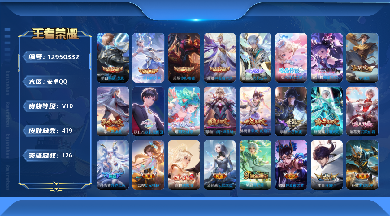 [12950332]【特价急出/详情看图】:安卓Q-V10-最强王者段位-126英雄-419皮肤-4典藏-1无双-2珍品传说-28传说-126史诗