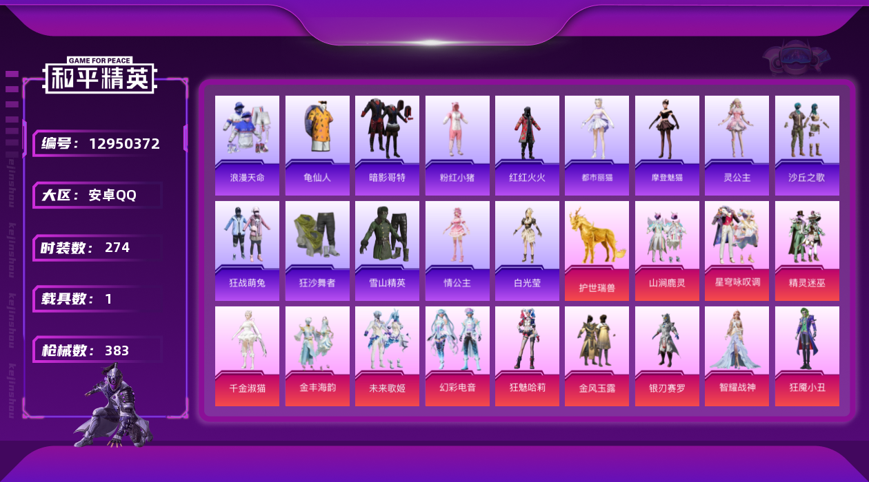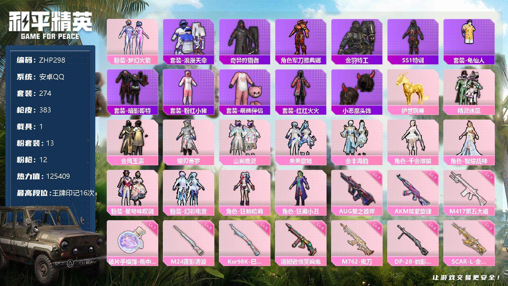 [12950372]素材身法号 安卓 手Q-13粉装-12特效枪-1载具-8粉色飞行器-12.5w热力值-16王牌印记-274套装-383枪皮【热门品类】:粉装-梦幻火箭,套装-浪漫天命,套装-奇异狩猎者,角色-军刀雅典娜,套装-金羽特工,套装-SS1特训,套装-龟仙人,套装-暗影哥特,套装-粉红小猪,套装-萌熊伴侣,套装-红红火火,小恶魔头饰【粉色载具】:护世瑞兽【粉色套装】:粉装-精灵迷巫,粉装-梦幻火箭,粉装-金风玉露,粉装-银刃赛罗,粉装-山涧鹿灵,粉装-未来歌姬,粉装-金丰海韵,角色-千金淑猫,角色-智耀战神,粉装-星穹咏叹调,粉装-幻彩电音,角色-狂魅哈莉,角色-狂魇小丑【粉色枪皮等级】:AKM-炫紫旋律(七级),SCAR-L-金蛇镇世(三级),M416-灵猫魔法师(三级),AUG-星之彼岸(七级),M762-鬼刀(四级),汤姆逊-怪笑疯兔(四级),Kar98K-巳巳如意(五级),M24-莲影清波(五级),M417-第五大道(七级),DP-28-豹影疾电(四级),平底锅-喜羊羊与灰太狼(二级),破片手榴弹-瓶中星球(七级)【粉色飞行器】:深海曼妙飞行器,酣梦熊熊飞行器,梦幻火箭飞行器,太空嘟嘟飞行器,万象金身飞行器,墨金战记飞行器,终晖之翼飞行器