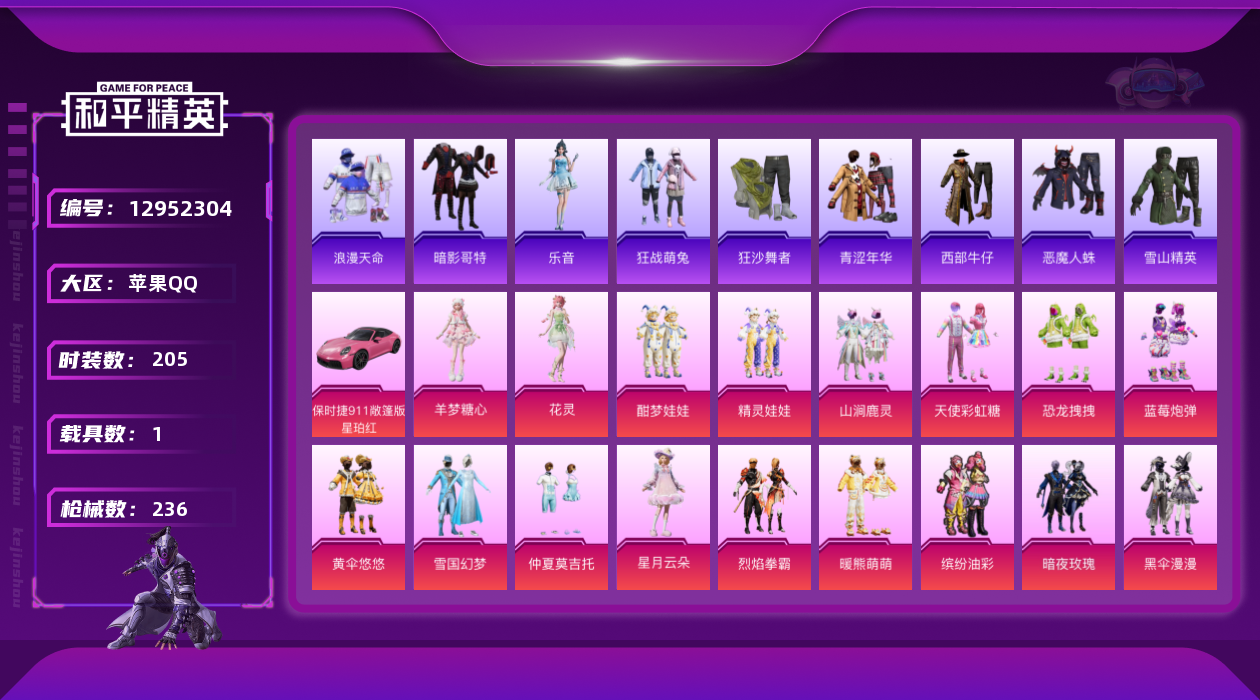 [12952304]素材身法号【特价急出/详情看图】:苹果 手Q-18粉装-14特效枪-1载具-3粉色飞行器-8.4w热力值-8王牌印记-205套装-236枪皮【热门品类】:粉装-雪国幻梦,粉装-缤纷油彩,套装-浪漫天命,套装-都市猎人,套装-胖达圆圆,套装-金羽特工,套装-动感兔斯基人偶服,套装-潮萌小黄鸭,套装-暗影哥特,套装-萌熊伴侣【粉色载具】:保时捷911 敞篷版(星珀红)【粉色套装】:粉装-天使彩虹糖,粉装-雪国幻梦,粉装-缤纷油彩,粉装-烈焰拳霸,粉装-暗夜玫瑰,粉装-山涧鹿灵,粉装-黄伞悠悠,粉装-黑伞漫漫,粉装-蓝莓炮弹,粉装-精灵娃娃,粉装-酣梦娃娃,粉装-恐龙拽拽,粉装-暖熊萌萌,粉装-仲夏莫吉托,粉装-星月云朵,角色-智耀战神,角色-花灵,角色-羊梦糖心【粉色枪皮等级】:AKM-梦之光华(四级),SCAR-L-机甲封神(一级),SCAR-L-甜梦小狐(五级),M416-五爪金龙(五级),M416-风花雪月(一级),M762-甜心娃娃(四级),ARX-无垠阁(五级),UMP45-宁雨蝶(三级),Vector-红伞翩翩(四级),Kar98K-绿意幻情(一级),SLR-暗夜玫瑰(一级),DP-28-豹影疾电(五级),MG3-洛神天依(五级),烟雾弹-甜梦果泡(五级)【粉色飞行器】:齐天大圣飞行器,甜心娃娃飞行器,天之羽翼飞行器
