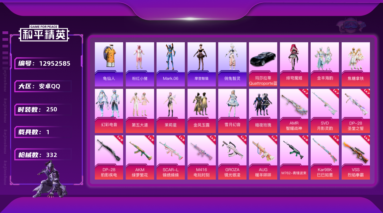 [12952585]素材身法号/地铁满天赋【特价急出/详情看图】:安卓 手Q-9粉装-14特效枪-1载具-5粉色飞行器-11.2w热力值-19王牌印记-250套装-332枪皮【热门品类】:套装-奇异狩猎者,套装-龟仙人,套装-粉红小猪,角色-Mark.06【粉色载具】:玛莎拉蒂Quattroporte(夜幕蓝)【粉色套装】:粉装-金风玉露,粉装-暗夜玫瑰,粉装-焦糖拿铁,粉装-第五大道,角色-茉莉星,粉装-金丰海韵,粉装-雪月幻音,粉装-幻彩电音,角色-绯穹魔姬【粉色枪皮等级】:AKM-绿萝繁花(五级),SCAR-L-锦绣绵绵(五级),M416-电玩时刻(五级),GROZA-镜光银凌(五级),AUG-暖羊咩咩(五级),M762-青锋波束(五级),Kar98K-巳巳如意(五级),VSS-烈焰拳霸(五级),Mk14-甜梦熊击(五级),AMR-智耀战神(七级),SVD-月影灵韵(七级),DP-28-暗夜鎏金(四级),DP-28-圣堂之誓(七级),DP-28-豹影疾电(五级)【粉色飞行器】:萌物绒绒飞行器,墨金战记飞行器,雀灵庇佑飞行器,时光之吻飞行器,灵猫魔法师飞行器