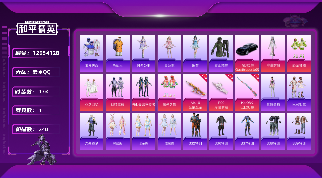 [12954128]素材身法号/地铁满天赋/M416-至情至圣(九级)【特价急出/详情看图】:安卓 手Q-6粉装-4特效枪-1载具-1粉色飞行器-7.5w热力值-7王牌印记-173套装-240枪皮【热门品类】:套装-浪漫天命,套装-龟仙人,套装-浪漫波比,小恶魔头饰【粉色载具】:玛莎拉蒂Quattroporte(夜幕蓝)【粉色套装】:粉装-PEL轰鸣竞梦者,粉装-幻情紫藤,粉装-恐龙拽拽,粉装-心之回忆,粉装-炫光之旅,角色-冷漠罗丽【粉色枪皮等级】:M416-至情至圣(九级),P90-冷漠罗丽(六级),Kar98K-巳巳如意(五级),Mk14-甜梦熊击(五级)【粉色飞行器】:春暖花开飞行器