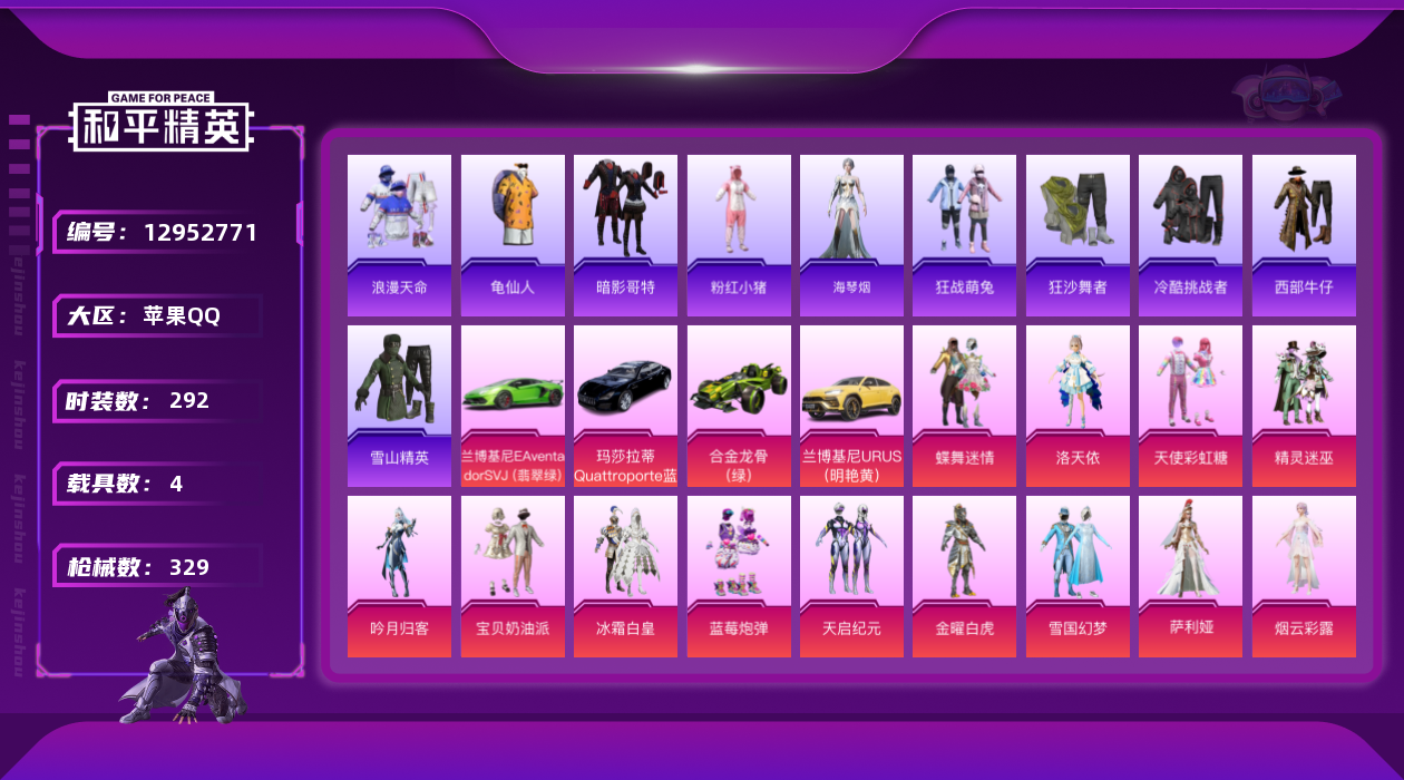 [12952771]素材身法号/地铁满天赋【特价急出/详情看图】:苹果 手Q-23粉装-11特效枪-4载具-6粉色飞行器-13w热力值-17王牌印记-292套装-329枪皮【热门品类】:粉装-雪国幻梦,粉装-梦幻火箭,套装-浪漫天命,套装-赤蝎幽灵,套装-都市猎人,套装-派对舞王,套装-深海小丑鱼,套装-小丑鱼,套装-奇异狩猎者,套装-胖达团团,套装-金羽特工,套装-忍者信条,套装-龟仙人,套装-暗影哥特,套装-粉红小猪,套装-萌熊伴侣,小恶魔头饰,熔岩游骑兵面罩,M416-星际漫游,熔岩游骑兵连帽夹克【粉色载具】:兰博基尼Aventador SVJ(翡翠绿),兰博基尼URUS(明艳黄),玛莎拉蒂Quattroporte(夜幕蓝),合金龙骨(绿)【粉色套装】:粉装-深海曼妙,粉装-极限特训,粉装-幻影战神,粉装-数码大师,粉装-甜心巧克力,粉装-宝贝奶油派,粉装-天使彩虹糖,粉装-土曜战麒,粉装-金曜白虎,粉装-雪国幻梦,粉装-蝶舞迷情,粉装-精灵迷巫,粉装-梦幻火箭,粉装-天启纪元,粉装-智能音符,粉装-放客神游,粉装-冰霜白皇,角色-洛天依,粉装-吟月归客,粉装-蓝莓炮弹,角色-烟云彩露,角色-萨利娅【粉色枪皮等级】:AKM-甜心宝贝(七级),SCAR-L-梦幻火箭(七级),M416-五爪金龙(五级),GROZA-镜光银凌(五级),AUG-超新星(七级),M762-鬼刀(五级),Kar98K-绿意幻情(四级),Kar98K-巳巳如意(五级),AWM-花间之火(五级),DP-28-豹影疾电(五级),MG3-洛神天依(七级)【粉色飞行器】:春暖花开飞行器,精灵迷巫飞行器,梦幻火箭飞行器