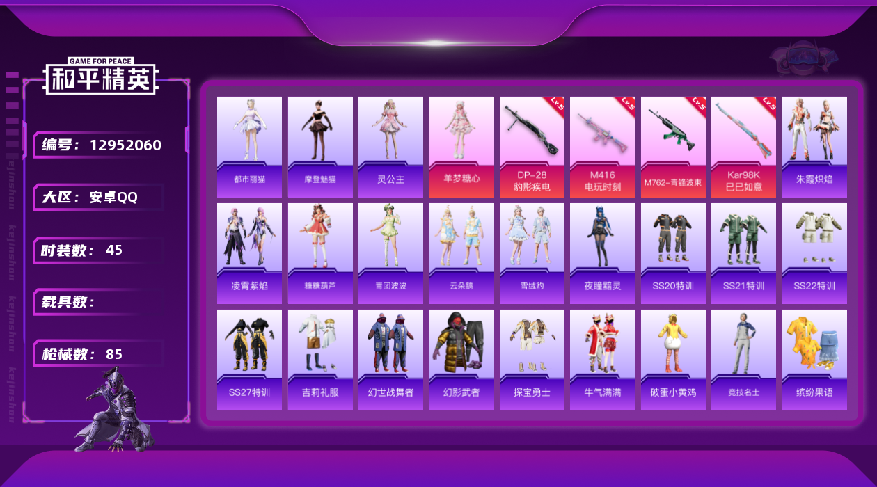 [12952060]地铁满天赋【特价急出/详情看图】:安卓 手Q-1粉装-5特效枪-2.2w热力值-2王牌印记-45套装-85枪皮【粉色套装】:角色-羊梦糖心【粉色枪皮等级】:M416-电玩时刻(五级),M762-青锋波束(五级),Kar98K-巳巳如意(五级),Mk14-甜梦熊击(五级),DP-28-豹影疾电(五级)