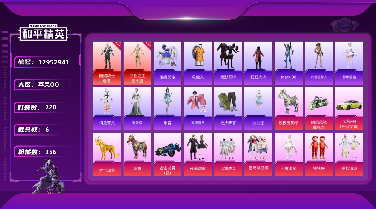 - [13630464]苹果 手Q-1神装-4粉装-3特效枪-5载具-3粉色飞行器-48315热力值-9王牌印记-95套装-130枪皮 【红色神装等级】:角色-青焰关公(三级) 【红色角色神装】:角色-青焰关公 【热门品类】:角色-忠猛周仓,角色-忠真马岱,角色-忠义严颜,套装-龟仙人,大砍刀-青龙偃月刀,撬棍-龙胆亮银枪 【粉色载具】:宾利飞驰(布罗德盖棕双色),幻影随行,越野奶龙龙,赤兔,照夜玉狮子 【粉色套装】:角色-擎天柱,粉装-傲傲奶龙,角色-脉冲星,角色-千金淑猫 【粉色枪皮等级】:M762-电糖天使(五级),Kar98K-巳巳如意(五级),DP-28-豹影疾电(五级) 【粉色枪皮】:M762-电糖天使,Kar98K-巳巳如意,DP-28-豹影疾电 【粉色飞行器】:齐天大圣飞行器,电糖天使飞行器 【粉色降落伞】:洛神天依降落伞,莲影清波降落伞,龙行天下降落伞,猪猪侠降落伞,精灵梦叶罗丽降落伞,创世·救赎降落伞,动力核心降落伞,鬼刀降落伞,樱桃泡泡降落伞 【稀有套装】:套装-龟仙人,套装-巳巳如意,套装-糖糖葫芦,套装-青团波波,套装-棉花软糖,角色-都市丽猫,套装-燕燕于飞,套装-鱼渊荷华,角色-风玲,角色-蜜桃派对,角色-灵公主 【稀有枪皮】:AKM-彩虹符号,AKM-生命誓言,AKM-虎虎生威,AKM-霓虹街区,M16A4-幻世战舞者,SCAR-L-暗夜玫瑰,M416-糯团青竹,M416-蓝色火焰,GROZA-异彩先驱,GROZA-影袭,GROZA-蓝莓炮弹,AUG-天降萌叽,AUG-耀粉歌者,M762-彩虹符号,M762-瑞龙福将,AC-VAL-天降萌叽,AC-VAL-快闪甜心,蜜獾-天降萌叽,UZI-啾咪啾咪,UZI-天降萌叽,UZI-炫彩节奏,UMP45-蓝色火焰,Vector-焰鹰斗篷,Vector-生命誓言,Vector-龙行天下,汤姆逊-异彩先驱,汤姆逊-炫彩节奏,汤姆逊-耀粉歌者,汤姆逊-樱桃泡泡,野牛-沙丘之主,MP5K-异彩先驱,AKS-74U-鬼刀,P90-快闪甜心,Kar98K-影袭,Kar98K-炫彩节奏,AWM-焰鹰斗篷,Mini14-异彩先驱,Mini14-炫彩节奏,Win94-瑞龙福将,AMR-喜羊羊与灰太狼,AMR-墨龙九天,M417-惊鸿侠骨,MK20-H-快闪甜心,MK20-H-莲影清波,M200-惊鸿侠骨,S686-生命誓言,S12K