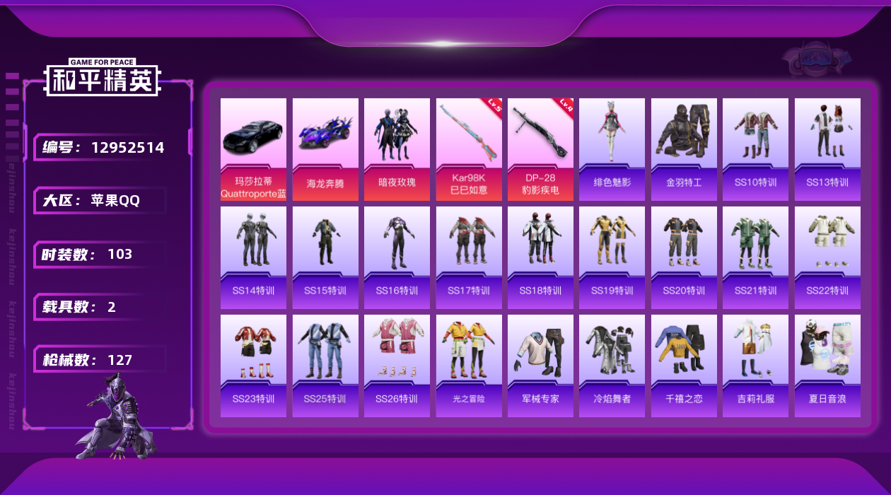 - [11498270]4粉装 5特效枪 1载具 7印记 可二次 可修改实名 身法装备:舞王派对(派对舞王、小金鞋),暗影哥特(红眼罩),Mark.06(新蓝螳螂) 优质装备:仰望U7先锋版(阿盖尔紫),舞王派对(派对舞王、小金鞋),绚金战神,M416风花雪月,SCAR-L-锦绣绵绵,UMP45量子极限,时空协奏·心弦,M416-女娲灵识,智耀战神,天鹅座 冰河,Kar98K-巳巳如意 热门装扮:呆萌铁蟹,深海小丑鱼,派对舞王(小金鞋) 五级特效枪:五级UMP45-量子极限,五级Kar98K-巳巳如意,五级SCAR-L-锦绣绵绵,五级M416-风花雪月 三级特效枪:三级M416-女娲灵识 紫色装扮:SS22特训,SS23特训,SS21特训,SS31特训套装,云朵鹅,雪绒豹,SS33特训套装,SS20特训,音速流光,瑞龙福将,团圆交子,SS17特训,异彩先驱,SS18特训,都市魅力,长空猛禽,雪鹰学院,雷霆特警,霓虹极客,青年教官,青春校园,缤纷果语,街头潮人,青涩年华,蓝海鲸歌,魅力单车,鹤鸣,黄色伏地魔,黑色伏地魔,龙的传人,蝶变,极地朋克,柠萌假日,格斗先锋,暗金炫舞,深蓝色名流,清新柠檬,幻影武者,夏日倾情,战地督导,绮丽涂鸦,白色伏地魔,破蛋小黄鸡,空投萌叽,王牌教练,灼焰舞者,猛禽,特殊使命,特训学院,猎鹰,小熊娃娃,雏菊兔兔,萝兰蝴蝶,SS29特训,湖畔霞光,星途旅人,创世·幻影,白光莹,纯真浪花,热情海星,SS28特训,Mark.06(新蓝螳螂),光矢逐梦,鱼渊荷华,燕燕于飞,巳巳如意,竞技名士,暗影哥特(红眼罩),惊鸿侠骨,SS25特训,锦衣飞扬,粉红小猪,SS27特训,浪漫天命,SS26特训,春光漫游,快闪甜心,智谋强哥,大橘大利,耀粉歌者,粉恋花,蓝冰羽,紫幽梦,SS32特训服(SS32特训套装),猎影月神,恋语绒绒,冰冻风暴,光之冒险 优质战备:创世·救赎降落伞,星空武士降落伞,千金淑猫降落伞,荧海星豚降落伞,鬼刀降落伞,智耀战神降落伞,彩虹独角兽降落伞,千面幻镜降落伞,炫光之旅降落伞,齐天大圣降落伞