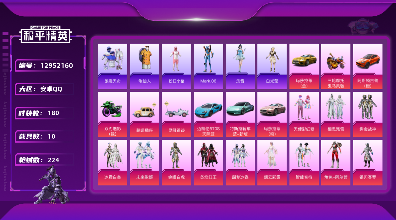 [12952160]素材身法号【特价急出/详情看图】:安卓 手Q-19粉装-7特效枪-10载具-3粉色飞行器-9.3w热力值-8王牌印记-180套装-224枪皮【热门品类】:粉装-梦幻火箭,粉装-童趣迷兔,套装-浪漫天命,套装-小丑鱼,套装-胖达圆圆,套装-AG战队服,套装-龟仙人,套装-浪漫波比,套装-粉红小猪,角色-Mark.06,熔岩游骑兵面罩,熔岩游骑兵连帽夹克 【粉色载具】:特斯拉Roadster(水滴蓝),阿斯顿马丁DBX(橙),玛莎拉蒂Ghibli(金),玛莎拉蒂Ghibli(粉),迈凯伦570S(天际蓝),灵鼠银迹,萌喵橘座,双人摩托-双刃魅影(绿),鬼马风驰,空客H135-蔚蓝之翼【粉色套装】:粉装-天使彩虹糖,粉装-金曜白虎,粉装-梦幻火箭,粉装-智能音符,粉装-绚金战神,粉装-银刃赛罗,粉装-冰霜白皇,粉装-童趣迷兔,粉装-炙焰红王,粉装-香水柠檬,粉装-暗翼战神,粉装-绮梦青鸾,粉装-星之彼岸,粉装-相思残雪,粉装-甜梦冰蝶,粉装-心之回忆,粉装-未来歌姬,角色-阿尔茜,角色-烟云彩露【粉色枪皮等级】:AKM-甜心宝贝(五级),M416-五爪金龙(七级),M416-电玩时刻(五级),GROZA-香水柠檬(五级),M762-激战未来(七级),汤姆逊-怪笑疯兔(四级),Kar98K-巳巳如意(一级)【粉色飞行器】:激战未来飞行器,终极赛罗飞行器,庄周梦蝶飞行器