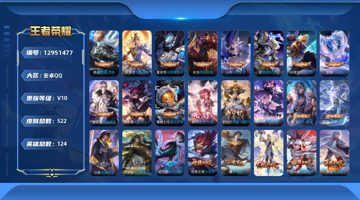 [12951477]对抗路37段/中路30段【特价急出/详情看图】:安卓Q-V10-最强王者段位-124英雄-522皮肤-11典藏-2无双-3珍品传说-67传说-188史诗 【荣耀典藏】:武则天英雄,孙悟空全息碎影,夏侯惇无限飓风号,小乔天鹅之梦,孙尚香杀手不太冷,鲁班七号星空梦想,李白鸣剑曳影,诸葛亮星域神启,花木兰九霄神辉,关羽赤影疾锋,铠银白咏叹调,貂蝉幻阙歌 【无双皮肤】:武则天神器明辉仪,妲己青丘九尾 【珍品传说】:嫦娥器灵落星盏,张飞兔狲蓬尾,安琪拉酷洛米之心 【传说皮肤】:干将莫邪千山共赴,元歌诡秘之主,大司命死亡执政官,司马懿九山相柳,司空震愿照山河定,女娲愿照千秋盛,艾琳觅芳踪,亚瑟追逃游戏,安琪拉追逃游戏,张飞百相守梦,公孙离记忆之芯,夏洛特浮生妄,干将莫邪画中仙,花木兰燃星之曲,虞姬无限倾心,项羽无限倾心,伽罗炽翼辉光,孙悟空齐天大圣,小乔山海琳琅生,曜山海苍雷引,李信山海炽霜斩,吕布怒海麟威,李白诗剑行,狄仁杰神器狴犴令,不知火舞绯月行,王昭君星穹之声,百里守约碎云,橘右京枫霜尽,娜可露露前尘镜,马可波罗深海之息,后羿无尽星芒,马超无双飞将,大乔挚爱花嫁,孙策挚爱之约,露娜启示之音,蔡文姬花朝如约,女娲补天,孙策末日机甲,孙尚香异界灵契,貂蝉遇见胡旋,赵云淬星耀世,王昭君乞巧织情,曜李逍遥 ,李元芳飞鸢探春,公孙离祈雪灵祝,诸葛亮时雨天司,铠绛天战甲,镜炽阳神光,虞姬启明星使,曜云鹰飞将,李信一念神魔,伽罗太华,貂蝉猫影幻舞,达摩黄金狮子座,百里玄策白虎志,花木兰冠军飞将,后羿黄金射手座,杨戬永曜之星,诸葛亮武陵仙君,貂蝉仲夏夜之梦,李白凤求凰,孙尚香末日机甲,宫本武藏地狱之眼,孙悟空地狱火,吕布天魔缭乱,武则天海洋之心,狄仁杰超时空战士 【限定皮肤】:白起狰,姜子牙天穹之誓,狄仁杰阴阳师,小乔纯白花嫁,虞姬凯尔特女王,小乔山海琳琅生,赵云皇家上将,赵云引擎之心,赵云龙胆,墨子神迹守卫,墨子降魔,妲己热情桑巴,妲己时之彼端,妲己时之奇旅,嬴政优雅恋人,嬴政白昼王子,孙尚香蔷薇恋人,孙尚香异界灵契,鲁班七号狮舞东方,庄周蜃楼王,庄周云端筑梦师,庄周玄嵩,庄周高山流水,高渐离死亡摇滚,阿轲迷踪丽影,钟无艳王者之锤,钟无艳超时空战士,孙膑妖精王,孙膑天狼运算者,扁鹊炼金王,扁鹊奇幻香踪,白起夜都怪侠,芈月重明,芈月白晶晶,芈月幻夜卜梦,吕布天魔缭乱,吕布猎兽之王,吕