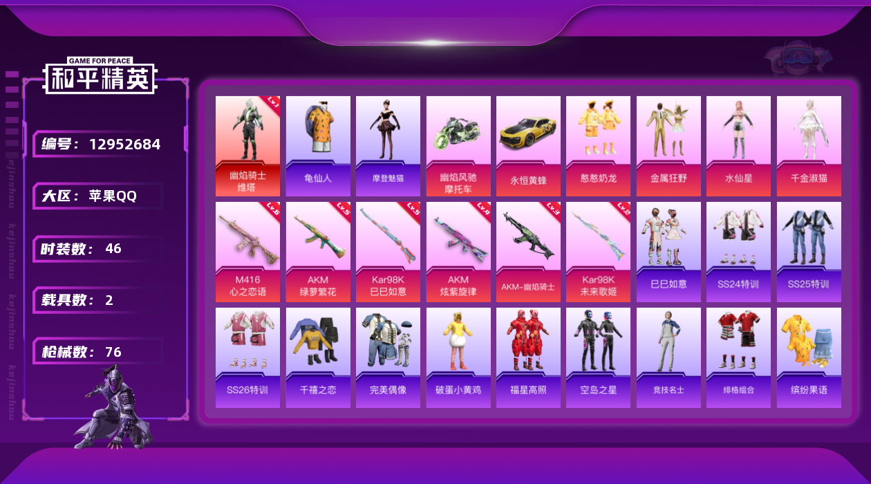 [12952684]地铁满天赋【特价急出/详情看图】:苹果 手Q-4粉装-6特效枪-2载具-27308热力值-3印记-46套装-76枪皮【红色神装等级】:幽焰骑士-维塔(一级)【红色角色神装】:幽焰骑士-维塔【热门品类】:套装-龟仙人【粉色载具】:永恒黄蜂,幽焰风驰摩托车【粉色套装】:粉装-金属狂野,角色-水仙星,粉装-憨憨奶龙,角色-千金淑猫【粉色枪皮等级】:AKM-炫紫旋律(四级),AKM-绿萝繁花(五级),AKM-幽焰骑士(三级),M416-心之恋语(六级),Kar98K-未来歌姬(二级),Kar98K-巳巳如意(五级)【粉色枪皮】:AKM-炫紫旋律,AKM-绿萝繁花,AKM-幽焰骑士,M416-心之恋语,Kar98K-未来歌姬,Kar98K-巳巳如意【粉色飞行器】:炫紫旋律飞行器,幽焰列车飞行器