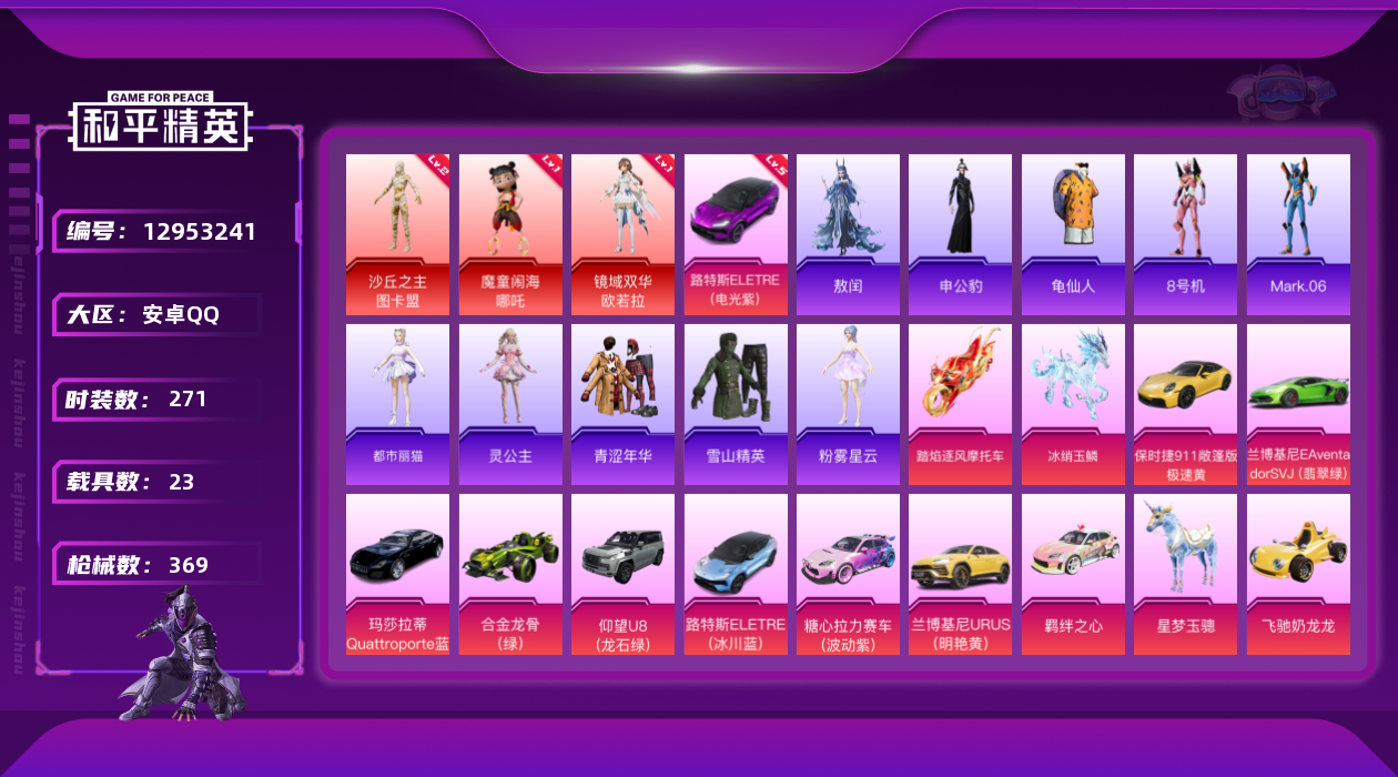 [12953241]素材身法号/老木乃伊/绝世印记7【特价急出/详情看图】:安卓 手Q-3神装-9粉装-9特效枪-23载具-7粉色飞行器-14w热力值-24王牌印记-271套装-369枪皮【红色载具】:路特斯ELETRE(电光紫)(五级)【红色神装等级】:魔童闹海-哪吒(一级),镜域双华-欧若拉(一级),沙丘之主-图卡盟(二级)【热门品类】:粉装-梦幻火箭,套装-冥河战士,角色-军刀雅典娜,套装-龟仙人,套装-潮萌小黄鸭,套装-浪漫波比,角色-8号机,角色-Mark.06,小恶魔头饰【粉色载具】:特斯拉Roadster(沁心粉),兰博基尼Aventador SVJ(翡翠绿),兰博基尼URUS(明艳黄),路特斯EVIJA(星际黄),路特斯ELETRE(电光紫),路特斯ELETRE(冰川蓝),玛莎拉蒂Quattroporte(夜幕蓝),玛莎拉蒂Ghibli(粉),仰望U8(龙石绿),宝马M4(圣保罗黄),迈凯伦塞纳(冷萃蓝),保时捷911 敞篷版(极速黄),合金龙骨(绿),海龙奔腾,飞驰奶龙龙,萌喵橘座,糖心拉力赛车(波动紫),羁绊之心,踏焰逐风摩托车,星梦玉骢,黑曜夜骑,冰绡玉鳞【粉色套装】:粉装-梦幻火箭,粉装-草莓生巧,粉装-王牌四分卫,角色-洛天依,粉装-暖暖奶龙,粉装-憨憨奶龙,角色-烟云彩露,角色-初号机 觉醒Ver.,角色-异瞳寒姬【粉色枪皮等级】:SCAR-L-魔童闹海 哪吒(三级),M416-墨龙九天(一级),M416-灵猫魔法师(三级),P90-沙丘之主(三级),Kar98K-巳巳如意(五级),M24-镜域双华(三级),DP-28-豹影疾电(五级),烟雾弹-甜梦果泡(五级),破片手榴弹-瓶中星球(七级)【粉色飞行器】:萌酷奶龙飞行器,沙丘之主天马,镜域双华-灵镜之阶,龙翔九天飞行器,灵猫魔法师飞行器,飞天猪飞行器,灵珠游龙飞行器