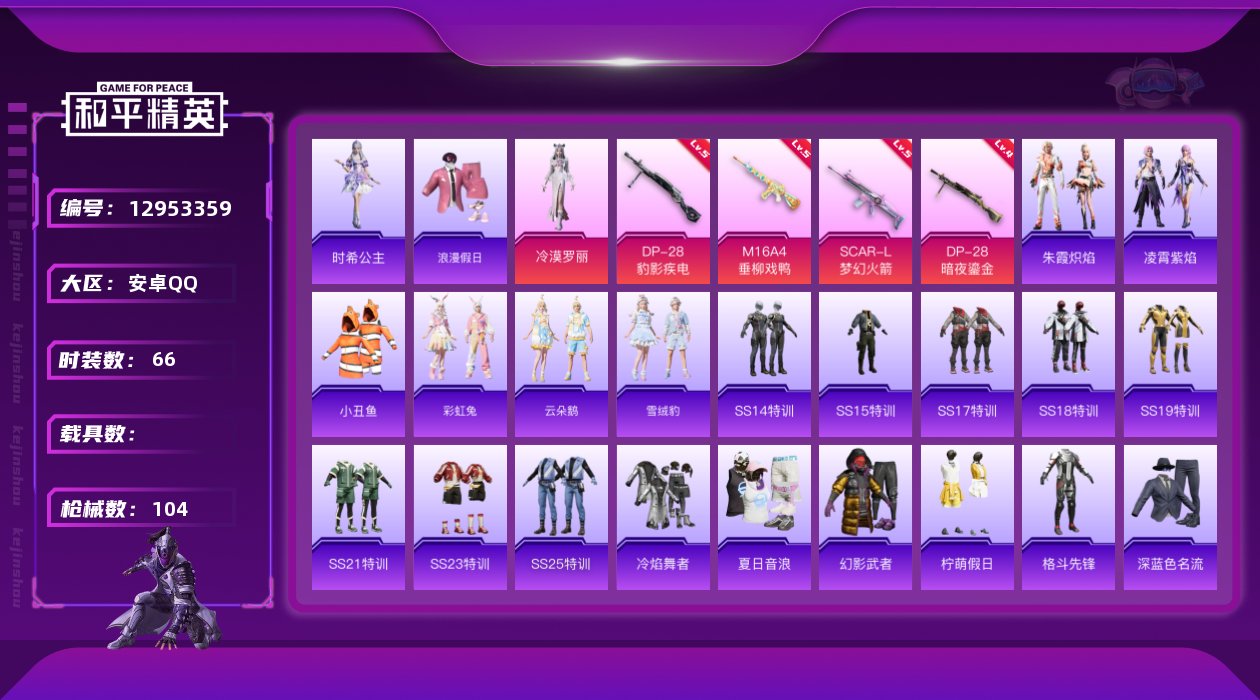 - PX_2096243- 苹果手Q-11王牌印记-13粉装-12特效枪-1载具-热力值-213套装-313枪皮-3卓越印记-2传奇印记 【13粉装】,梦幻火箭,初号机 觉醒Ver.,天使彩虹糖,繁龙极客,狂魅哈莉,极致幻想,古堡领主,复仇流浪者,樱桃泡泡,挚爱序曲,金丰海韵,幻影战神,烟云彩露 【12特效枪】AKM-幽焰骑士-1级 AKM-梦之光华-1级 AKM-炫紫旋律-7级 SCAR-L-锦绣绵
