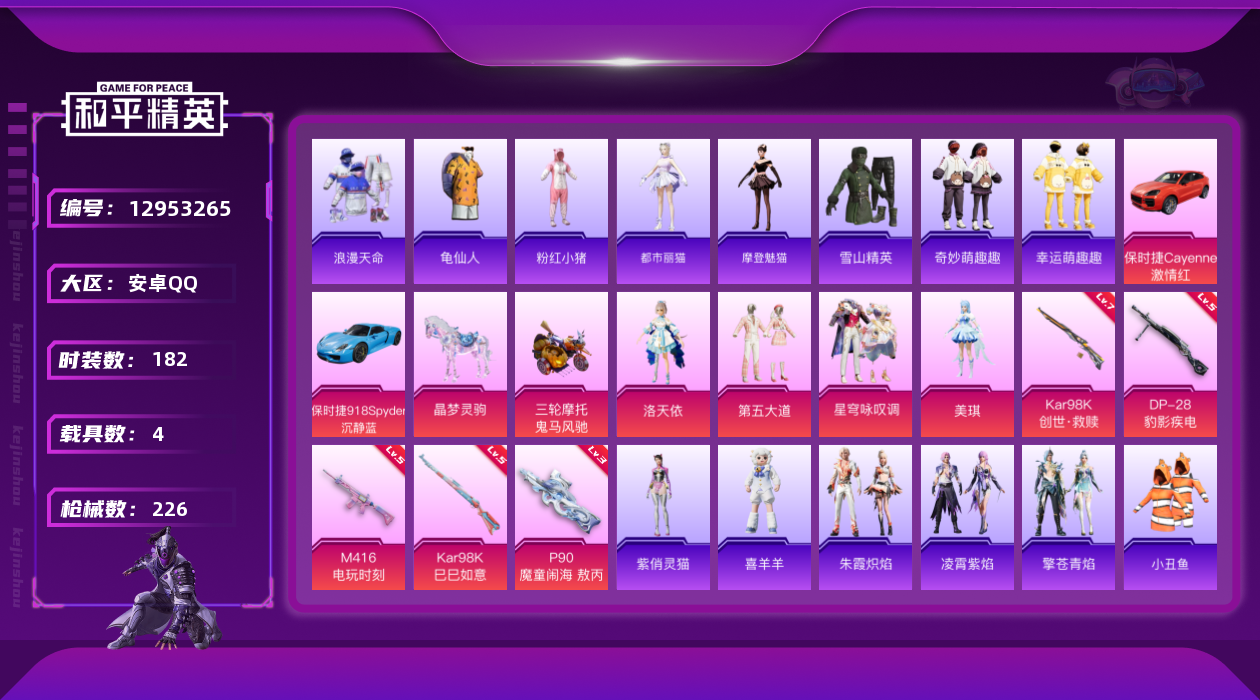 [12953265]素材身法号【特价急出/详情看图】:安卓 手Q-4粉装-5特效枪-4载具-8粉色飞行器-7.1w热力值-9王牌印记-182套装-226枪皮【热门品类】:套装-浪漫天命,套装-小丑鱼,套装-胖达圆圆,套装-龟仙人,套装-粉红小猪【粉色载具】:保时捷918 Spyder(沉静蓝),保时捷Cayenne(激情红),鬼马风驰,晶梦灵驹【粉色套装】:角色-洛天依,粉装-第五大道,角色-美琪,粉装-星穹咏叹调【粉色枪皮等级】:M416-电玩时刻(五级),P90-魔童闹海 敖丙(三级),Kar98K-创世·救赎(七级),Kar98K-巳巳如意(五级),DP-28-豹影疾电(五级)【粉色飞行器】:齐天大圣飞行器,星夜魔法师飞行翼,鎏金朋克飞行器,霓虹漫游飞行器,雀灵庇佑飞行器,时光之誓飞行器,终晖之翼飞行器,飞天猪飞行器