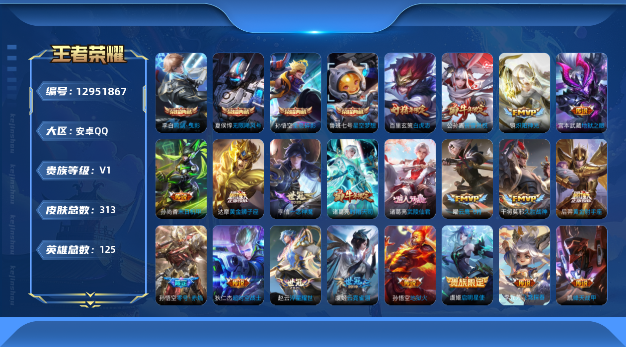 - [11605133]V8 20传说 124英雄 241皮肤 可修改实名 优质装备:炽阳神光,一念神魔,地狱之眼,胖达荣荣,时之恋人-刘备(电焊工),无双飞将,山海·炽霜斩(李信年限),山海·苍雷引(电光曜子),电玩·雷克斯,澜逐花归海,琥珀纪元马超 传说皮:乘龙·铭钟鼎(赵云年限),乘龙·淬吴钩(孙策年限),幻光神枪 珍宝阁皮:妄想食味,蔷薇恋人 限定皮:愿照·九州拓(澜年限),愿照·岁时盈(虞姬年限),愿照·山河定(司空震年限),鸣野蒿,夏侯惇霜北刀,至尊宝,傲雪梅枪,降魔,五谷丰年,青龙志(铠年限),龙胆,烈魂,虎魄,百木心枪,山海·玄木吟(马可年限) 史诗皮:飞车小橘子,器灵·浮梦炉,星界战将,谪仙醉月,龙之律动,藏狐·褐绒,石田雨龙,茶境仙,破空之剑,超元猎域,百相守梦-百里守约,百相守梦-黄忠,紫霞仙子,黄金分割率,特工魅影,千年之狐,永昼,江河有灵,百解令(蒙犽),高渐离燃音魔法,蒙恬荣光圣徽,青蛇,百相守梦(刘备),末日机甲-吕布,猫狗日记-孙策,节奏热浪,修罗,水果甜心,绅士熊喵,天才门将,功夫厨神,德古拉伯爵,暗隐猎兽者,鬼剑武藏,暗渊魔法,心灵战警,乐园奇幻夜,地狱岩魂,纤云弄巧,拒霜思,缤纷独角兽,乘风破浪,逐浪之夏,水晶猎龙者,曙光守护者,箭羽风息,金属风暴,圣诞狂欢,圣诞恋歌,鹰眼统帅,魅力维加斯,赏金猎手,无心,未来纪元-赵云