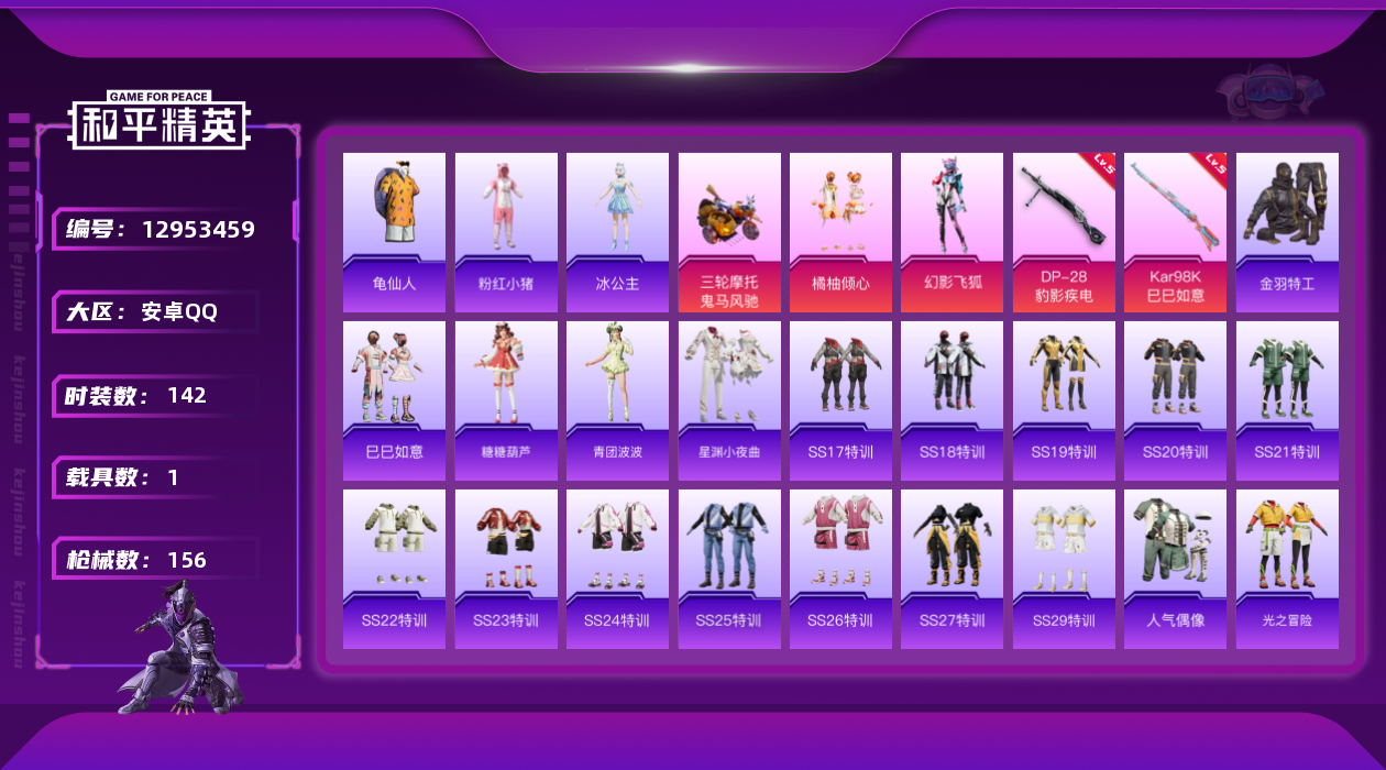 [12953459]【特价急出/详情看图】:安卓 手Q-2粉装-2特效枪-1载具-3粉色飞行器-4.7w热力值-9王牌印记-142套装-156枪皮【热门品类】:套装-奇异狩猎者,套装-金羽特工,套装-龟仙人,套装-粉红小猪【粉色载具】:鬼马风驰【粉色套装】:粉装-橘柚倾心,粉装-幻影飞狐【粉色枪皮等级】:Kar98K-巳巳如意(五级),DP-28-豹影疾电(五级)【粉色飞行器】:庄周梦蝶飞行器,闪光银龙飞行器,太空嘟嘟飞行器