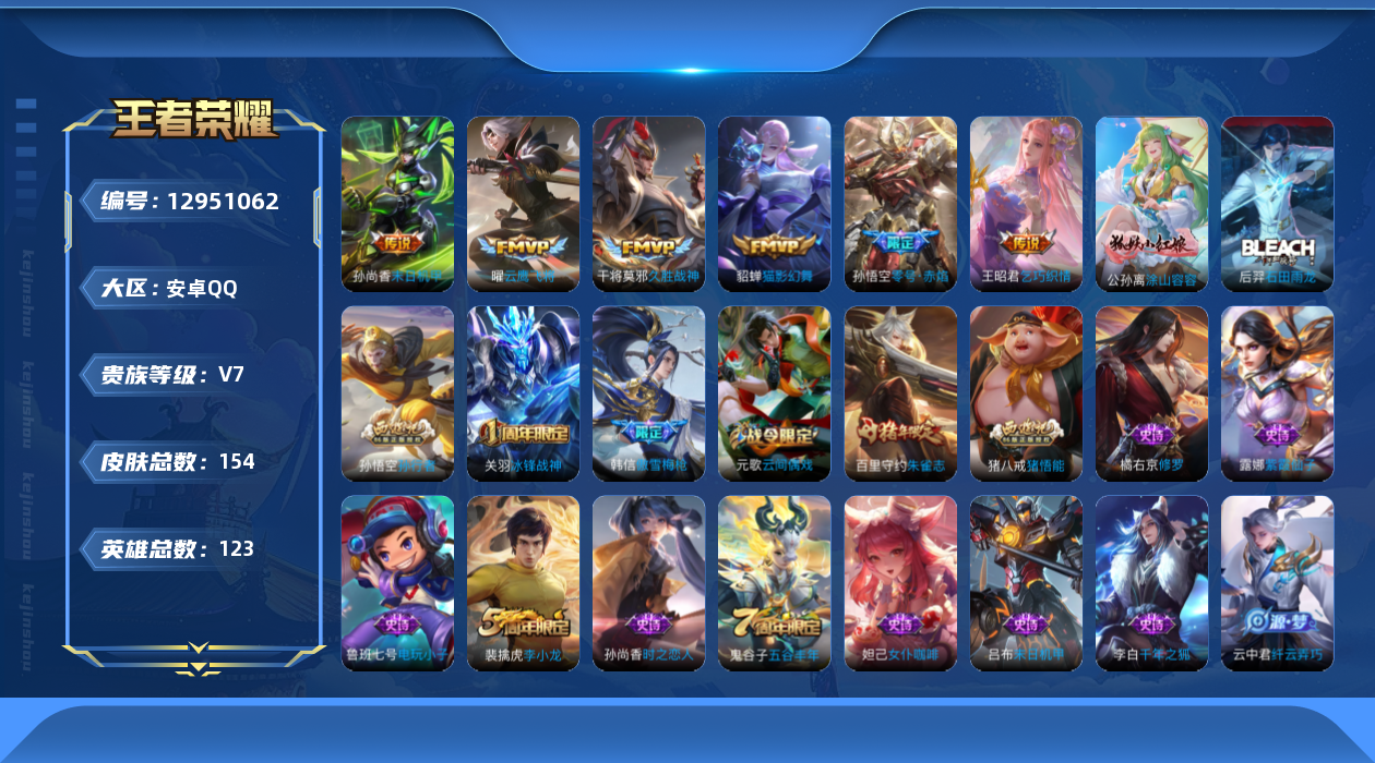 [12951062]【特价急出/详情看图】:安卓Q-V7-最强王者段位-123英雄-154皮肤-6传说-46史诗