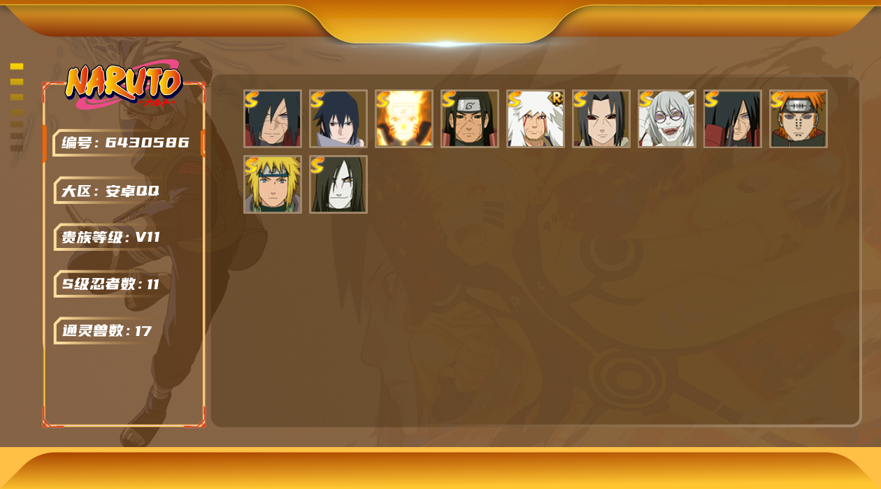 [6430586]火影忍者-安卓QQ VIP11 战力:6282491,段位:中忍2阶,本服排名:737,战区排名:未上榜,S忍者数量:11,A忍者数量:25,忍者星数:380, 【S忍】九喇嘛连结漩涡鸣人,永恒万花筒宇智波佐助,舞之豪杰自来也,大蛇丸,波风水门,秽土转生千手柱间,秽土转生宇智波斑,秽土转生·解宇智波斑,秽土转生宇智波鼬,天道佩恩,仙人模式药师兜 【A忍】迈特凯,猿飞阿斯玛,疾风传我爱罗,干柿鬼鲛,蝎,飞段,仙人模式漩涡鸣人,万花筒写轮眼宇智波佐助,须佐能乎宇智波佐助,忍界大战秋道丁次,忍界大战日向宁次,忍界大战李洛克,新春限定波风水门,青年波风水门,近松十人卫千代,五代目水影照美冥,忍界大战奇拉比,青年艾,迪达拉,秽土转生迪达拉,死司凭血飞段,暴怒宇智波带土,六代目水影长十郎,桃式显现漩涡博人,四代目土影黑土