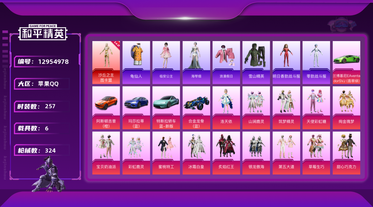 [12954978]素材身法号/绝世印记1/SCAR-L-天蓬元帅(九级) 苹果 手Q-1神装-21粉装-16特效枪-6载具-11粉色飞行器-12.6w热力值-25王牌印记-257套装-324枪皮【红色神装等级】:沙丘之主-图卡盟(二级)【热门品类】:粉装-梦幻火箭,套装-小丑鱼,角色-军刀雅典娜,套装-龟仙人,套装-潮萌小黄鸭,套装-浪漫波比,小恶魔头饰【粉色载具】:特斯拉Roadster(水滴蓝),兰博基尼Aventador SVJ(翡翠绿),阿斯顿马丁DBX(橙),玛莎拉蒂Ghibli(蓝),合金龙骨(蓝),空客H135-蔚蓝之翼【粉色套装】:粉装-甜心巧克力,粉装-宝贝奶油派,粉装-天使彩虹糖,粉装-梦幻火箭,粉装-草莓生巧,粉装-翡翠骑士,粉装-冰霜白皇,粉装-炙焰红王,粉装-暗翼战神,粉装-星之彼岸,粉装-蜜桃特工,粉装-银龙傲海,粉装-暗夜玫瑰,粉装-彩虹鹿灵,粉装-山涧鹿灵,角色-洛天依,角色-2号机款机体服,粉装-绚金瑰梦,粉装-筑梦精灵,粉装-第五大道,角色-冷漠罗丽【粉色枪皮等级】:AKM-梦之光华(七级),AKM-星际浪客(一级),SCAR-L-梦幻火箭(一级),SCAR-L-天蓬元帅(九级),M416-五爪金龙(一级),M416-墨龙九天(三级),GROZA-焦糖拿铁(六级),M762-甜蜜誓约(四级),UMP45-相思残雪(七级),P90-沙丘之主(三级),Kar98K-巳巳如意(五级),M24-镜域双华(二级),AWM-焰龙焚天(四级),Mini14-绚金瑰梦(四级),SLR-暗夜玫瑰(四级),MG3-洛神天依(四级)【粉色飞行器】:酣梦熊熊飞行器,梦幻火箭飞行器,夏日绵绵冰飞行器,相思残雪飞行器,枪炮玫瑰飞行器,沙丘之主天马,镜域双华-灵镜之阶,龙翔九天飞行器,圣域金龙飞行器,雀灵庇佑飞行器