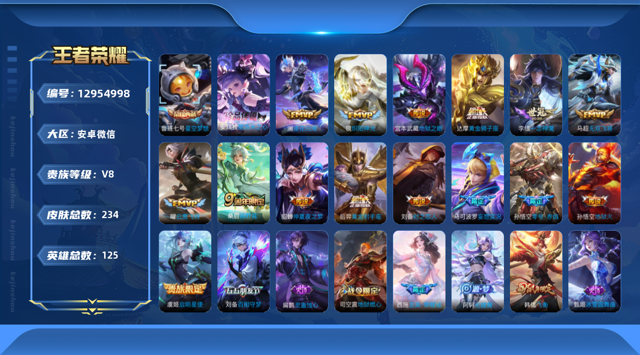 [12954998]安卓WX-V8-永恒钻石V段位-125英雄-234皮肤-1典藏-0珍品无双-0无双-1珍品传说-15传说-48史诗
